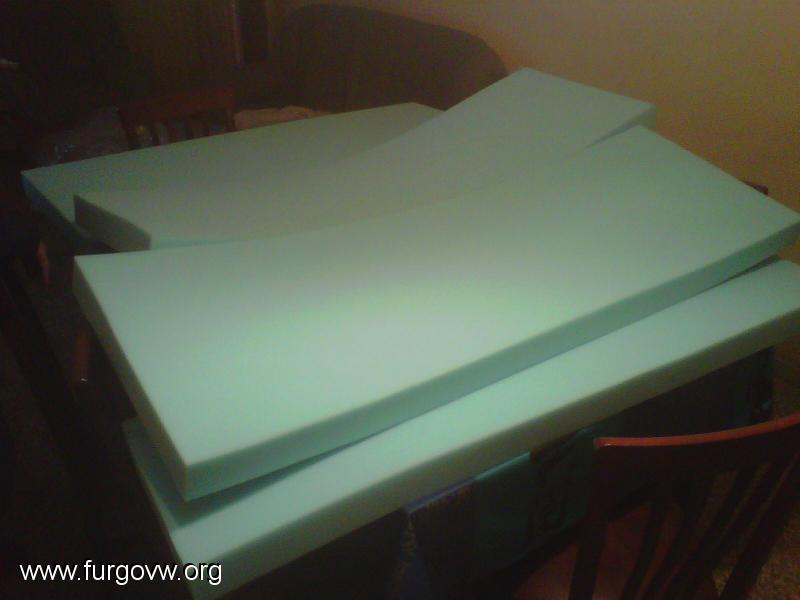 buenas, yo cuento lo mio, yo compre en la tienda del barrio los tres trozos d espuma para la cama d la multivan, son de unos 6cm y la densidad no es la blanda son d color azul como las d sofa, un poco mas dura k la esponja amarilla, y bueno yo aconsejaria comprarlas mas gordas, porke o duermo boca arriba o boca abajo, pero d lado t aces polvo pero polvo.