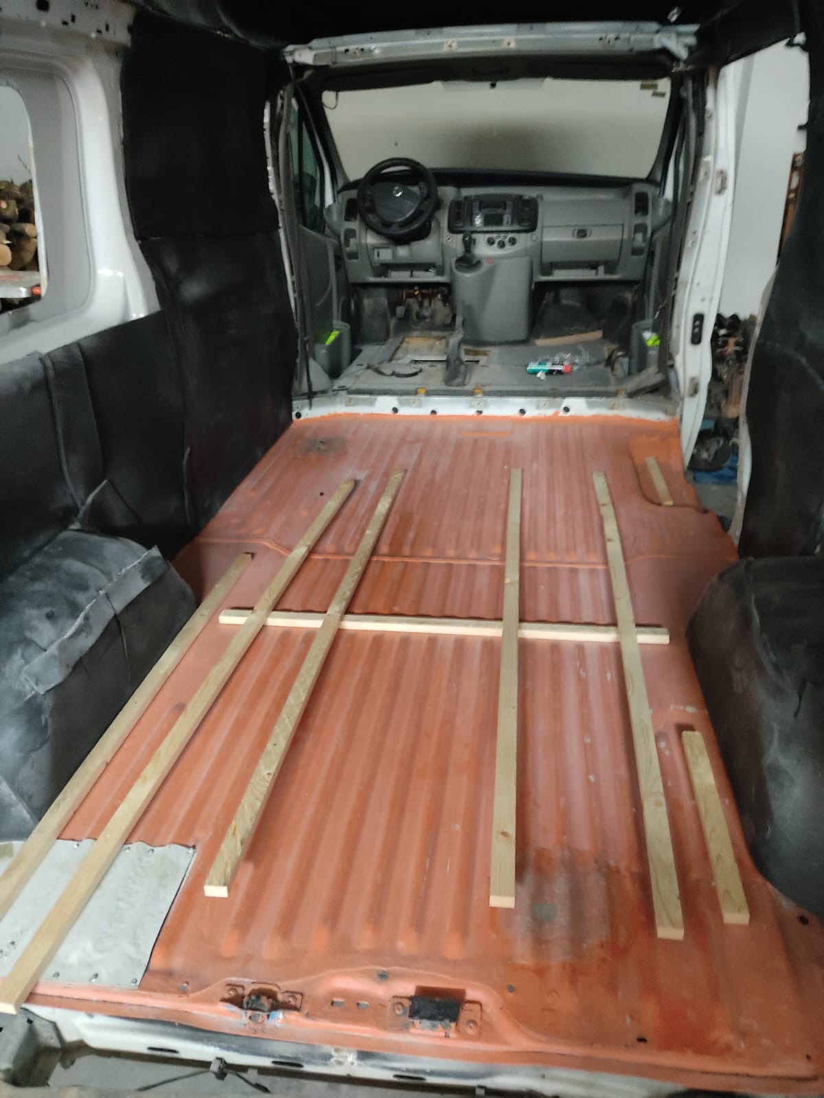 A nivel camperización, he quitado la separación de carga con vehículo, he comprado una puerta lateral con ventana de desguace y he dejado completamente vacío la parte de carga, además de haber lijado todo el óxido y haber dado un tratamiento antióxido.