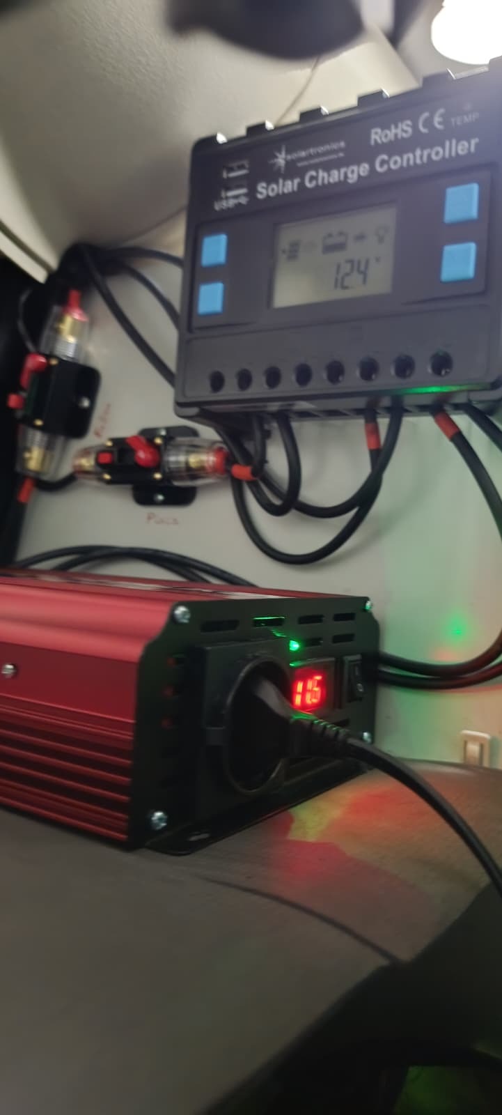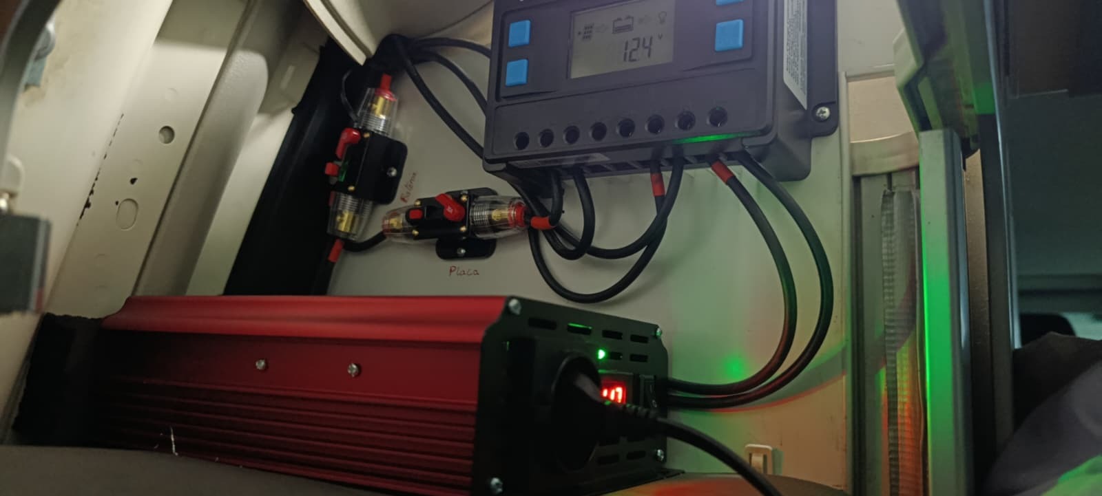 Buenos dias, al final me decidido y he montado placa de 170 W con el sistema que aquí se indica, pensando que tendría que montar y desmontar para poder entrar en el garaje, y resulta que me sobran unos pocos cm, osea entro y salgo bien. una cosa menos. Lo mío ha sido más fácil pues al llevar dos baterías, la instalación la he hecho a la del mueble, no he querido desmontar la nevera para que me leyera la carga el shunt, si eso ya lo hare el día de mañana. Como lo he tenido que hacer para poder cargar la e-Bike, he tenido que montar también un inversor de onda pura, con lo que he subido desde  la bat otra toma de mas sección hasta este que tengo en el estante superior del mueble trasero. En un principio tome la corriente desde el regulador, pero he leído que esta toma solo para iluminación y poca tensión. Un saludo