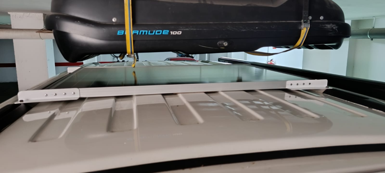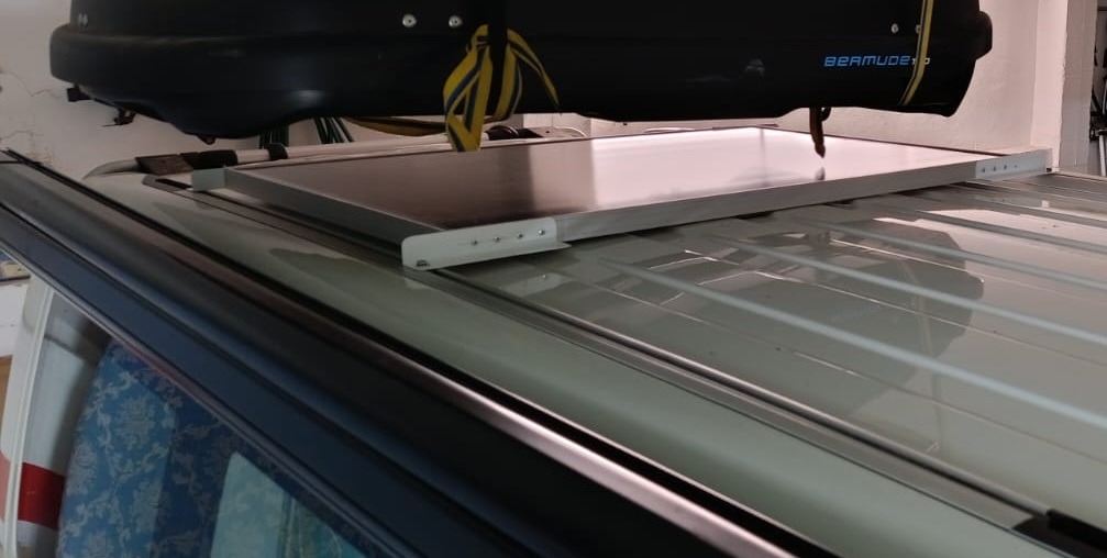 Lo que quería era que la placa se encajara en los raíles que llevo en el techo, por eso me decidí a comprar una placa rígida y montar una subestructura que se pudiera sacar con facilidad.