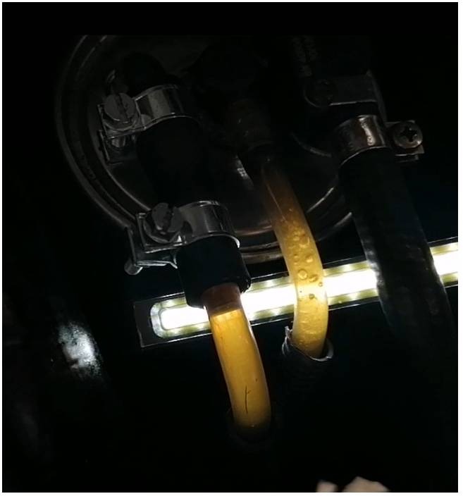 Hoy he grabado un video, ¿alguien me puede decir si es normal este aire en este tubo? Se aprecia poniendo una luz por la parte inferior y creo que es el gasoil que va del filtro a la bomba de baja. Sería el tubo 119 en el esquema.