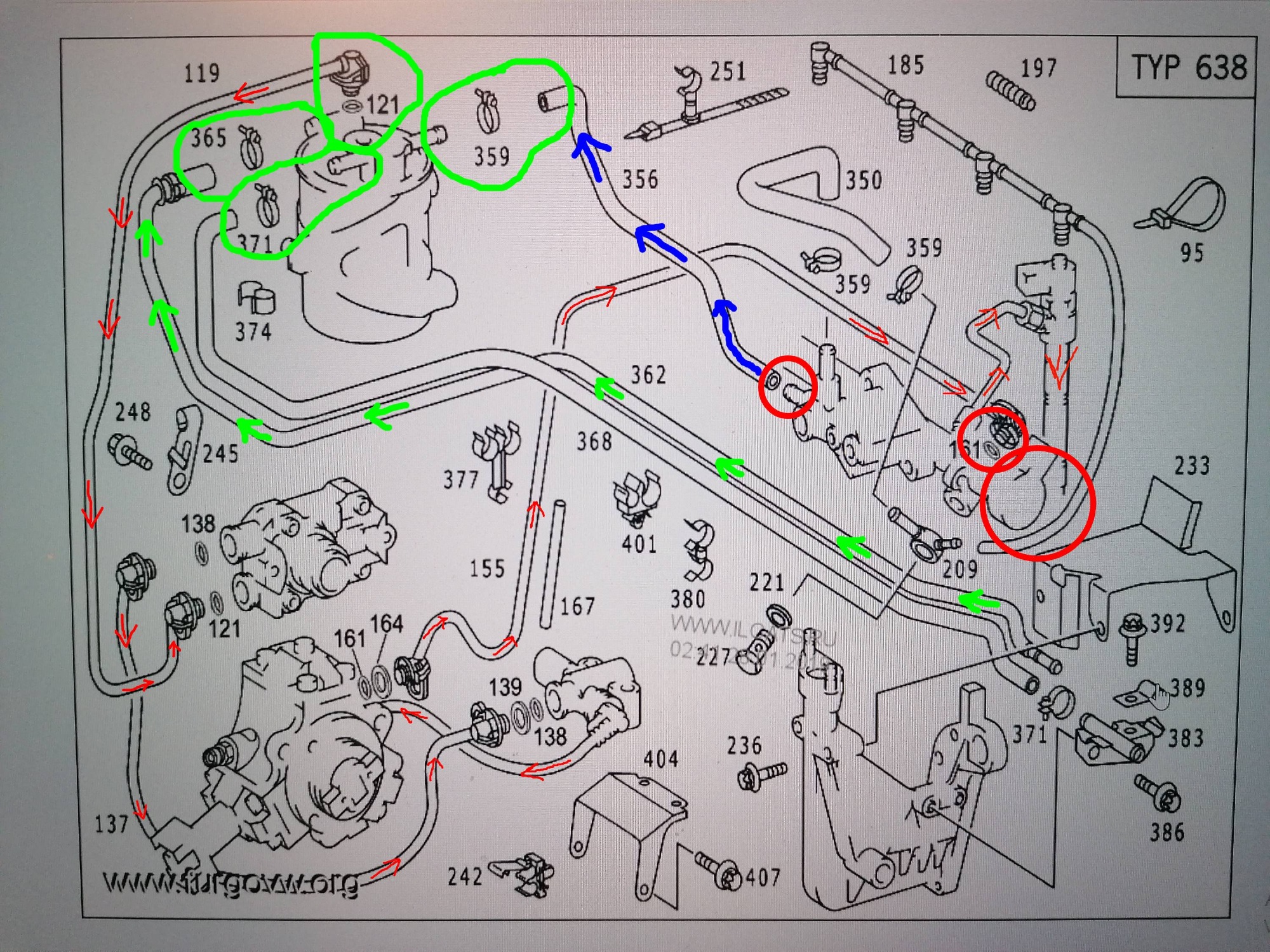 Mecanico con 30 años experiencia de mercedes me ha dicho sin verla que es junta torica de valvula oresion combustible del common rail. Es de color verde y se suele picar.
