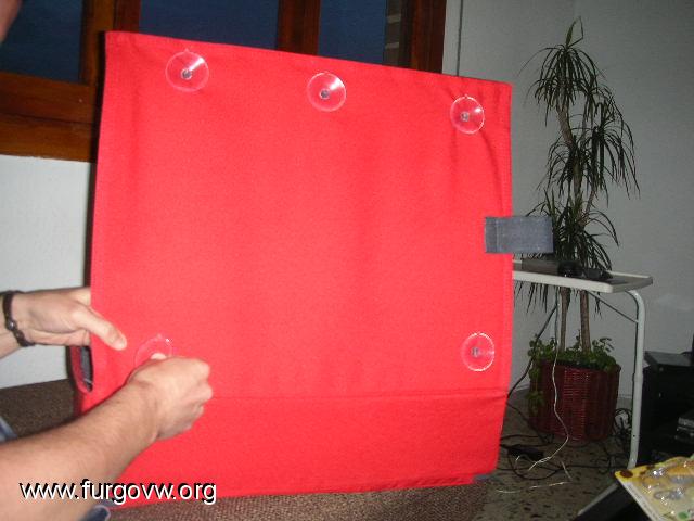 Despues volvemos a meter el cartoncillo en su funda y con el cutter hacemos cuatro agujeritos en la tela para poder introducir las ventosas