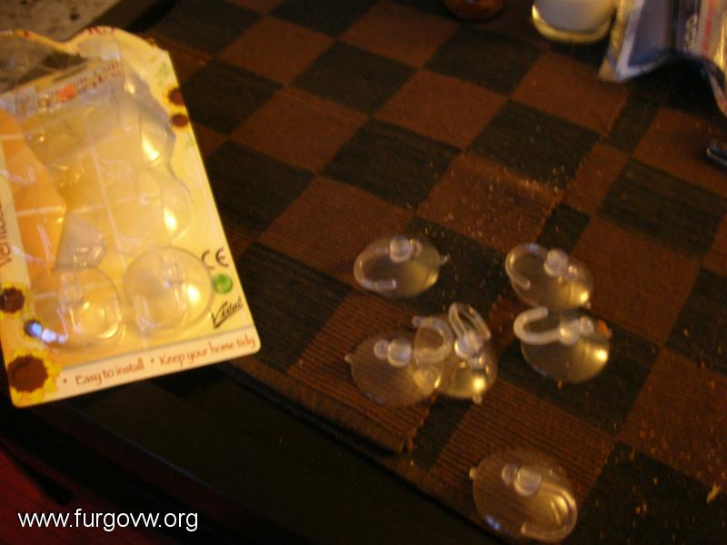 Con un cutter rasgamos un lateral para poder sacar el carton, y con un taladro grueso le hicimos un agujero lo suficientmene grande para poder meter la parte trasera de unas ventosas de esas de los chinos que tienen un agujerito para meter un pasador en forma de gancho (0,70€ 8 ventosas) a cada esquina dejando un margen de unos 2 cm en el borde...