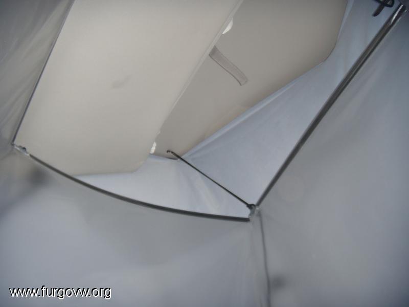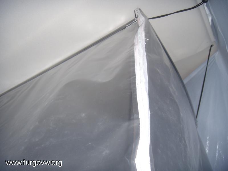 Hola, te paso algunas fotos de la sujeción. Lleva cuatro enganches arriba en cada esquina con cuerdecitas para atar a los puntos que se encuentran en la furgo, en el caso de la T5 a los ojales de la red para niños o los bombines que levantan la cama.