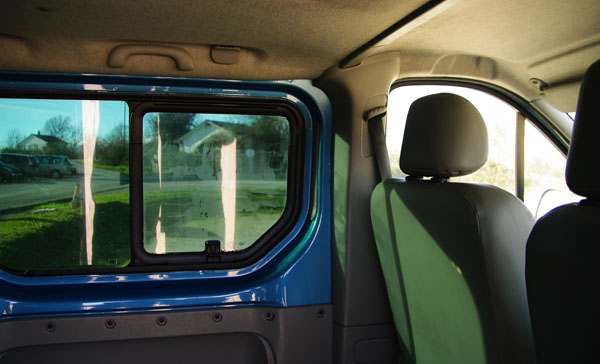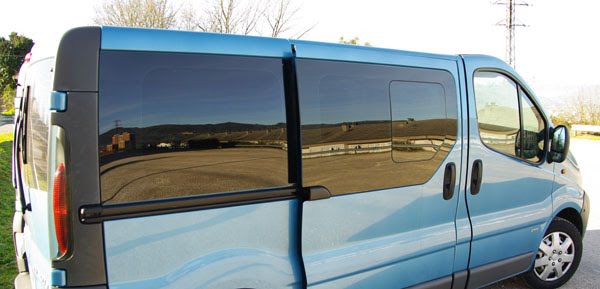 Como en el foro ya se habló largo y tendido sobre la colocación, no le damos más vueltas. Nosotros hicimos unos perfiles previamente para llevar más o menos bien recortadas las láminas. De todas formas siempre hay que afinar los recortes de los bordes durante la colocación. Las laterales traseras son quizá las más complicadas de manipular por su tamaño (70 x 50 cm) y es muy recomendable hacerlo entre dos. La colocación no es complicada pero lleva su tiempo, hay que contar unos tres cuartos de hora por cristal... y el primero saldrá con burbujas y dobleces, seguro! ;)