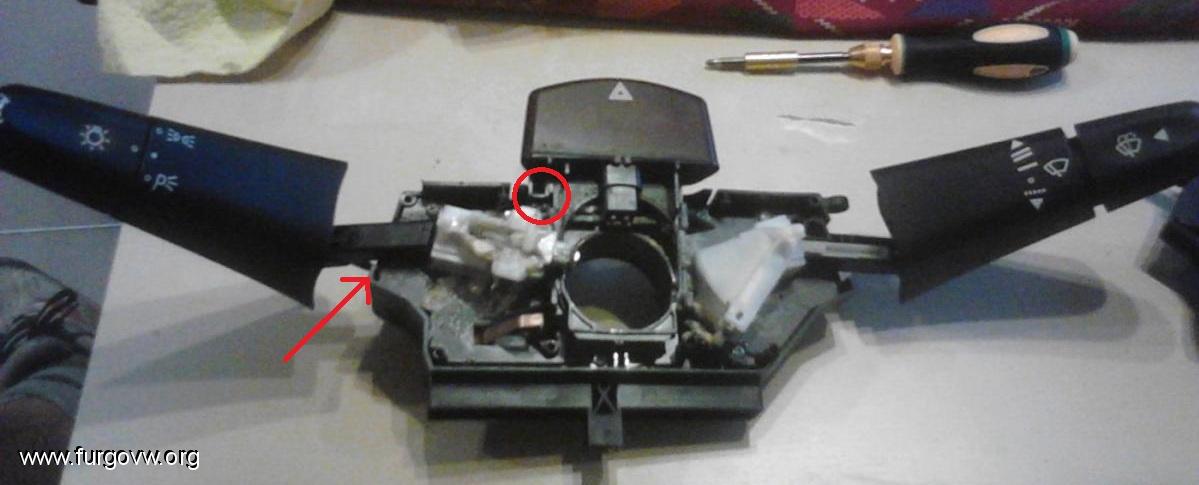 Échale limpiacontactos por detrás de las manetas donde veras un hueco, que ahí están los contactos (por delante solo están las piezas de plástico que hacen el juego y un montón de grasa), y revisa los conectores de las bombillas, que suelen oxidarse. Los contactos del interruptor de emergencia están donde te señalo, pero no se si podrás acceder sin desmontarlo.