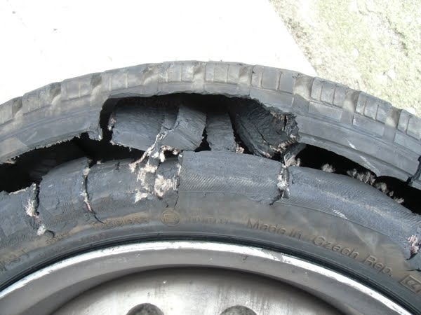 Según vosotros, puede ocurrir algo así por pisar algo en la carretera? A mi no me lo parece porque lleva el flanco exterior destrozado y el interior también tiene rotura...