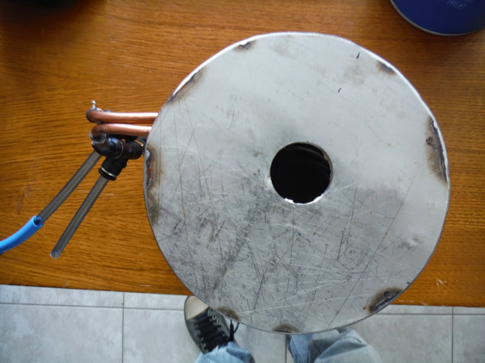 el calentador funciona por recirculación. el serpentin es un tubo de freno de un coche. y el tubo exterior de inox. puede parecer algo rupestre, pero funcióna y es utilizable tanto en camping gas como en la cocina de la furgo.