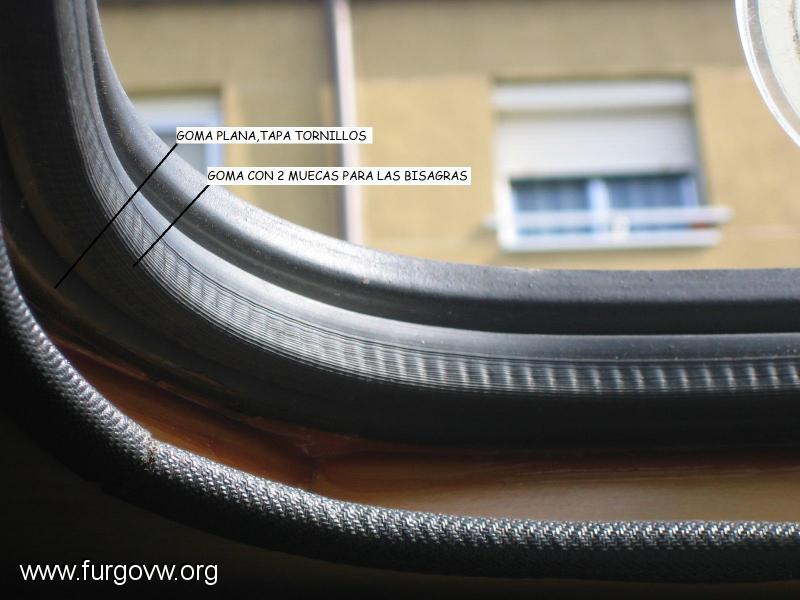 La goma cuadrada gorda va entre los dos marcos.Primero el exterior con su sellador dado,luego el interior que es el que tiene los abujeros para los tornillos que luego van tapados con la goma plana para que no so vean.