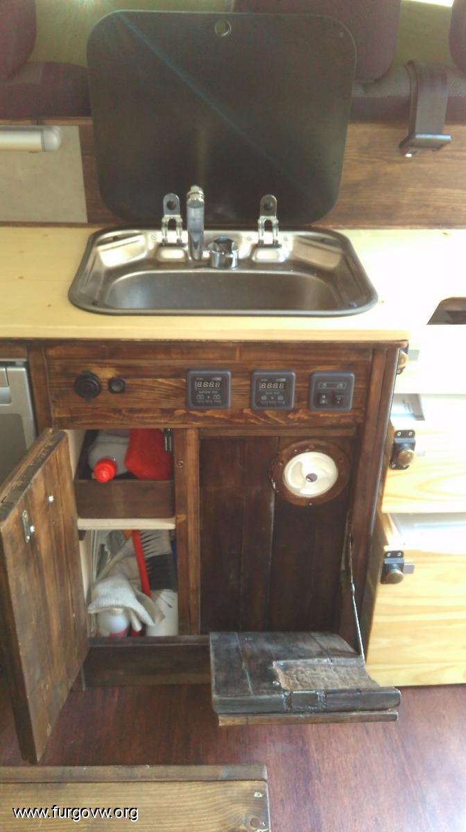 por otro lado, como ya se ha dicho, cuanto mas cerca de los tanques se ponga y menos recorrido tenga q hacer el agua, mejor es. Ahora bien, debido a los disgustos que se han llevado varios compañeros, del tipo "osti, es que me han echado gasoil en donde el agua", "me han mangado el tapón del agua"..., para evitar agujerar chapa, por comodidad, para tenerlo "escondido", por tema de distribuir mejor el peso y tal, yo personalmnete he preferido poner la bocana en el interior, dentro del mueble de la cocina. Pero, claro, para gustos colores!