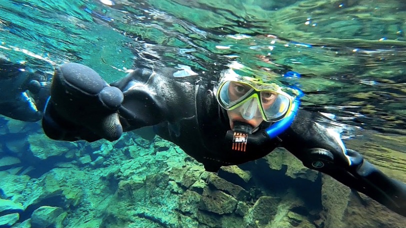 Después hacemos unos cuantos km para llegar al último punto del círculo Dorado: el Parque Nacional de Þingvellir, donde están el 1er parlamento democrático del mundo y la falla entre las placas tectónicas Euroasiática y Americana. Caminamos por la grieta Almanagjá, parte de esa separación, pero que está tan a reventar de gente que no permite apreciarlo al 100%, y compramos por fin alguna cosilla en la tienda de souvenirs (no habíamos podido hasta ahora). Volvemos a la furgo y nos preparamos con calcetines de lana altos, mallas gordas y camiseta térmica porque vamos a vivir otra experiencia única: hacer snorkel en la falla Silfra, una fisura rellena de una de las aguas más puras y cristalinas del mundo, ya que proviene del glaciar Langjökull y viaja subterránea 80 km hasta emerger aquí, filtrándose a cada paso, y con una ta todo el año de 2 grados (sí, lo sé, muy apetecible). Nuestra guía es una islandesa rubia de pura cepa y se llama Bryndis jeje, nos coloca un mono térmico y encima el drysuit, una especie de neopreno estanco.