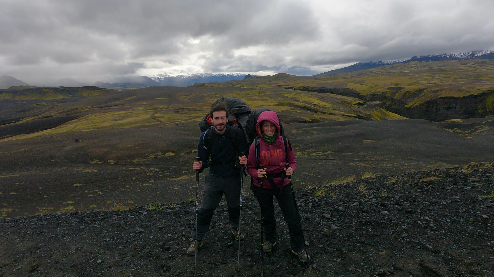 Pablo tiene una pierna dolorida y sufre bastante, yo estoy resentida según qué haga pero en bien. Y tras un último repecho desértico, ante nosotros aparece un horizonte brutal con el refugio de hoy Emstrur/Botnar.