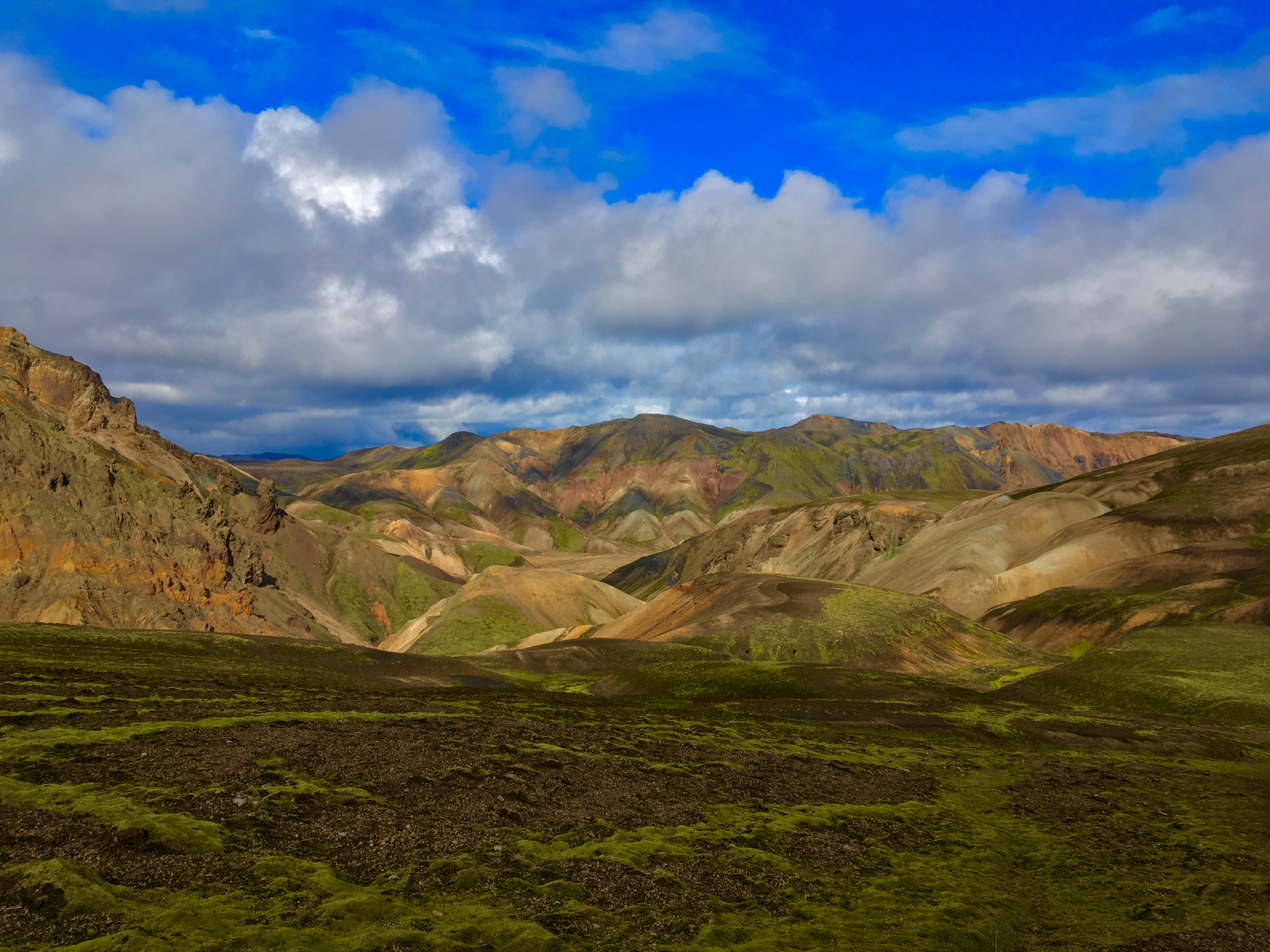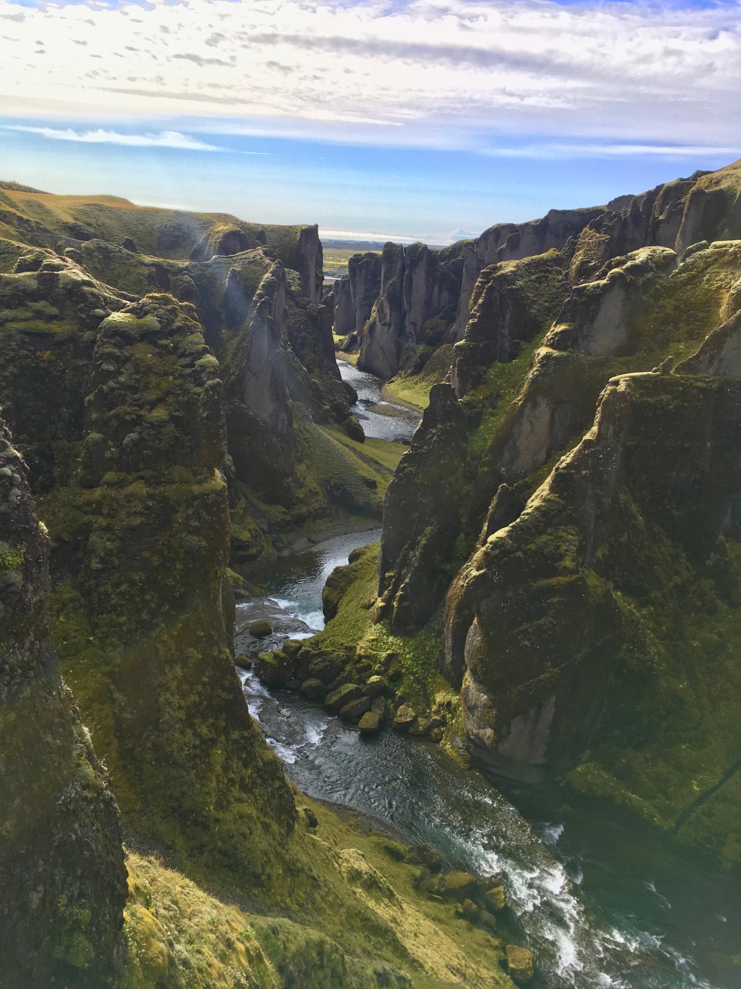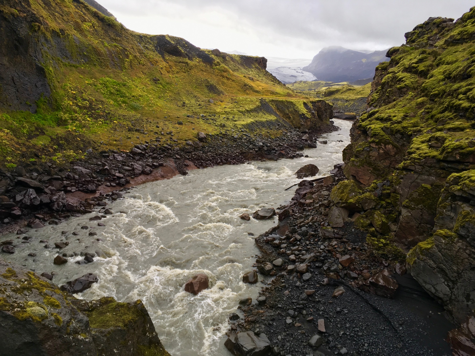 Amanecemos con un día espléndido, no me lo puedo creer para ser Islandia, genial. Desayunar y enseguida nos ponemos en marcha para hacer los 4 km de pista que nos quedan hasta el camping de Þakgil, desde donde sale el trekking. Está en un sitio privilegiado, encañonado en un lugar total y absolutamente verde, con el río al lado y una cueva/abrigo natural que usan como comedor. Preparamos mochilas y palos y al lío: comenzamos subiendo sin tregua, pasando tramos de musgo verde fosforito y también una pista de piedra un poco pesada, vemos alguna cascadita de lejos.