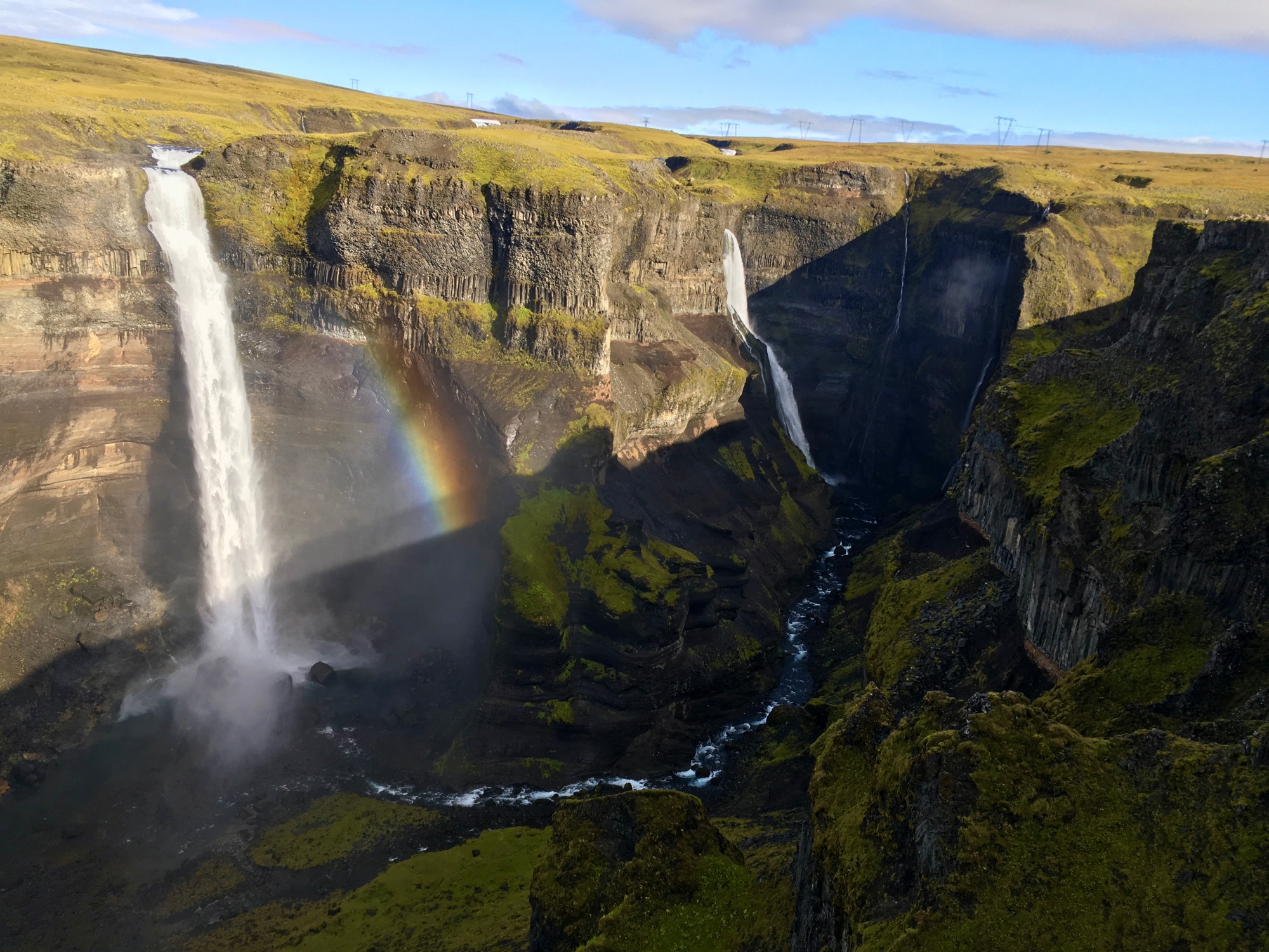 Desayunamos en la carpa helados, pero dejamos en el baño al calorcito del radiador todo secando, y después nos vamos a visitar las cascadas de Haifoss y Granni. Están en un cañón al que se llega por una pista de 7 km con baches que... hemos dudado, pero con muuucho cuidado el Kia picanto se ha portado como un campeón... Se da un aire en el tipo de caída al salto del Nervión, pero en bestial: según te asomas al borde del acantilado está todo tapizado de verde de arriba a abajo, con formas redondeadas, y además de Haifoss que te estruenda con su caída, a la derecha se ven caer más finitas otras 4, y ha salido un arcoíris con el agua en suspensión... precioso conjunto!