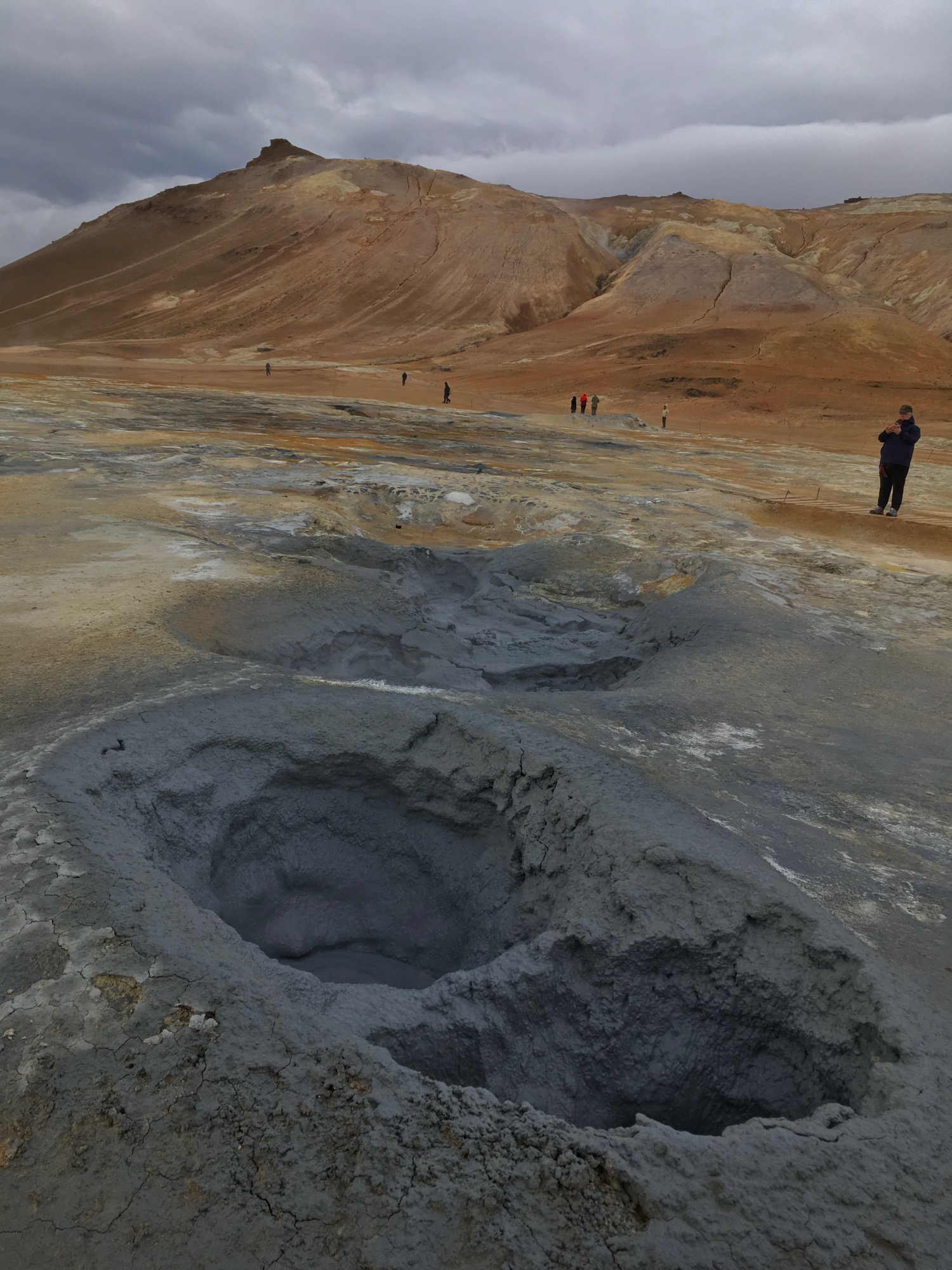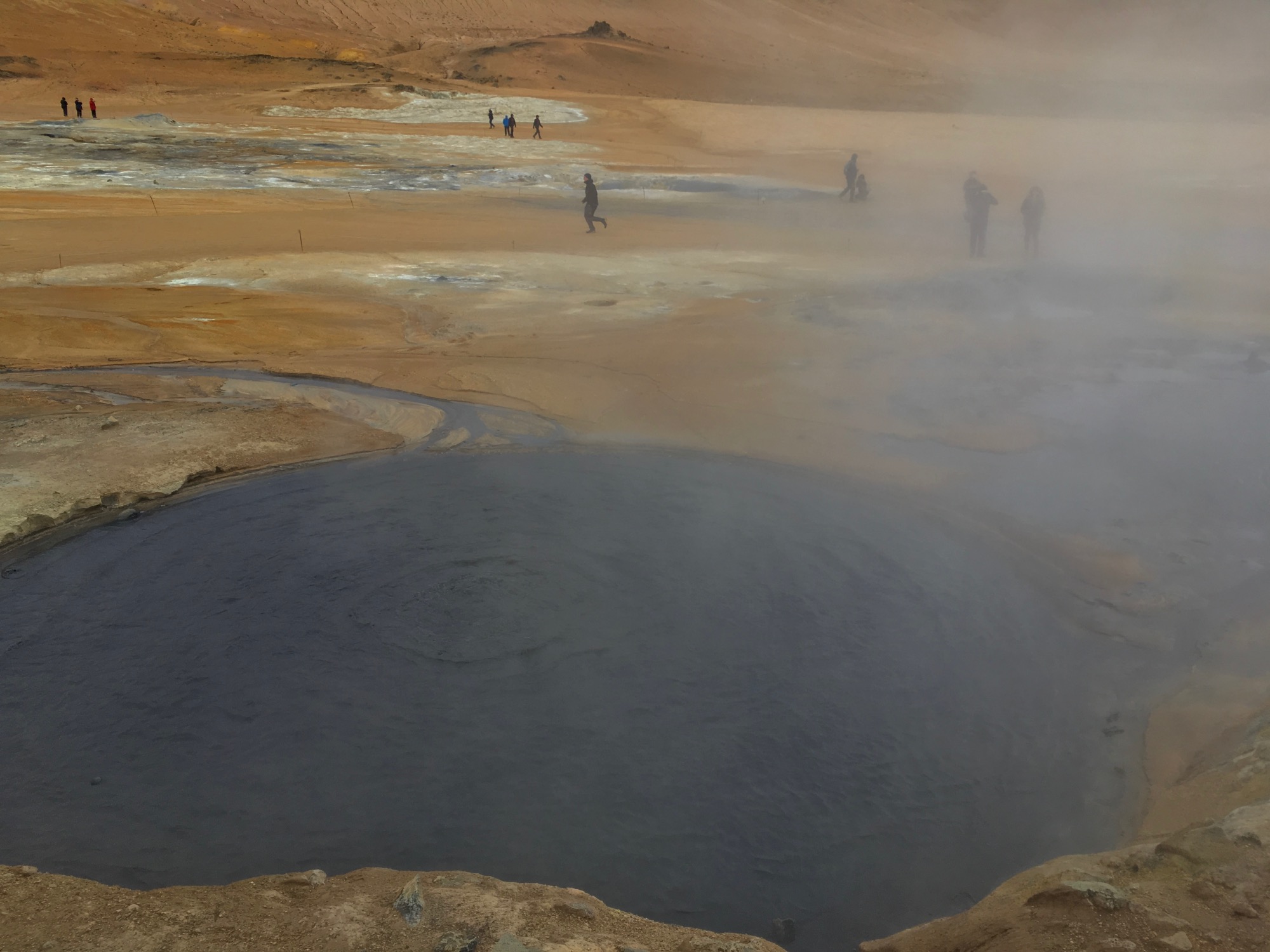 Nos acercamos a ver el campo geotermal de Seltún, muy parecido al de Hverir pero en pequeño, menos brutal... o eso nos parece, pozas de barro y agua, río lechoso, colores, fumarolas, olor desde lejos...