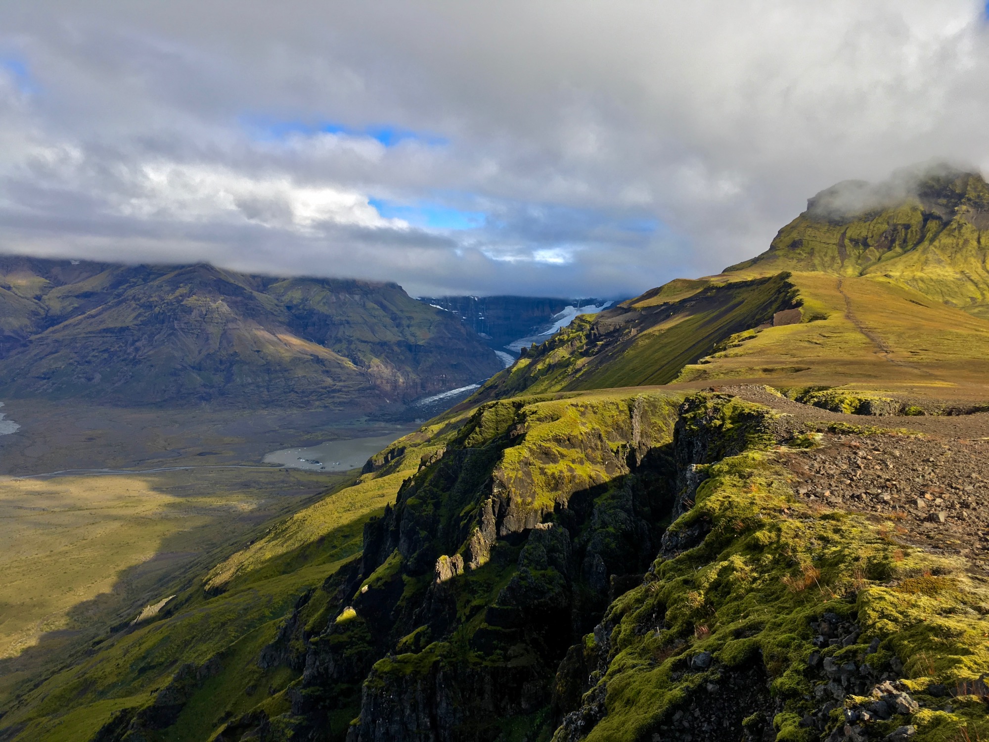Pero subir tiene recompensa: se comienza a ver el glaciar Myrdalsjökull cada vez más (bajo él, el volcán Katla), y un lago.