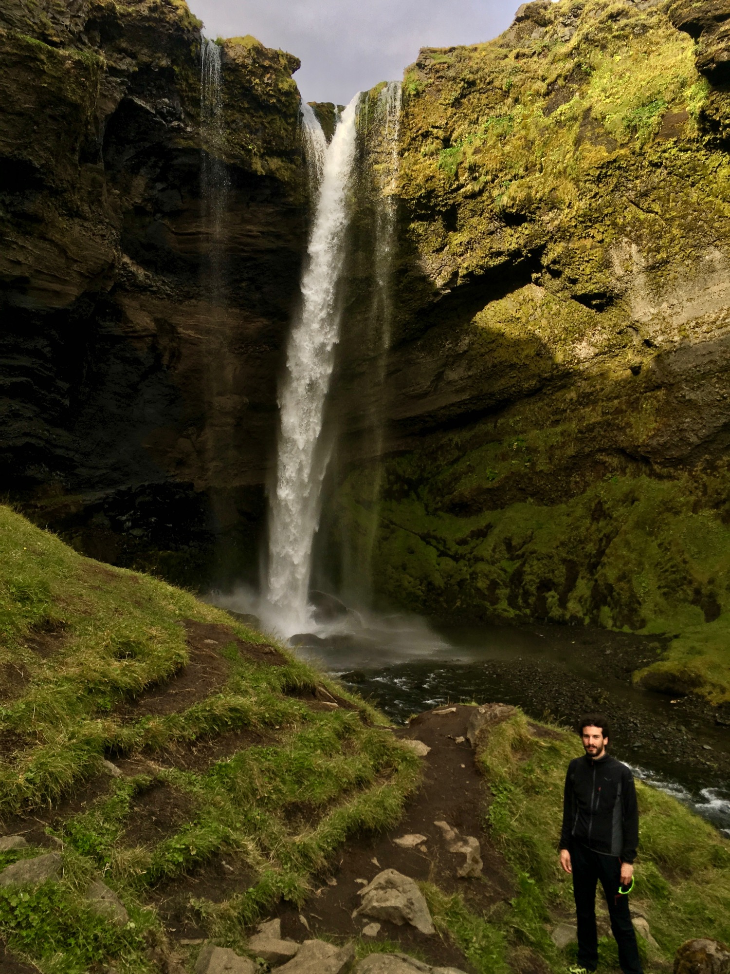 Comenzamos a ver un poco de paredón del circo glaciar con varias caídas pequeñas de agua, dos de ellas con arcoíris como la famosa de Noruega, pero nos queda lejos... y según nos acercamos al borde de la barranquera se ve la magia: Huldufoss, una de las cascadas más jóvenes de Islandia, que nace del borde del glaciar y cae separada de la pared del circo hasta un agujero que ha creado abajo donde está otra parte de la lengua del glaciar. Impresionante.