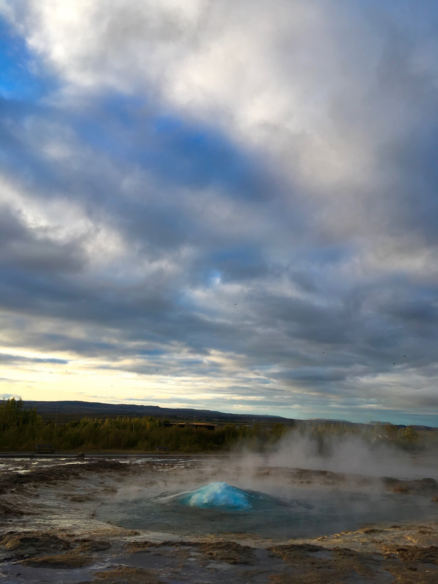 Hay otros 5 geysers, pero el más famoso es Strokkur porque es muy regular y expulsa un chorro de unos 35 m cada 5-10 min, y es una pasada, primero un ratito ves burbujear el agua y luego, según aumenta la presión subterránea, se va formando como una semiesfera hasta que expulsa con presión un chorro de agua a 80-100 grados hacia arriba en vertical.