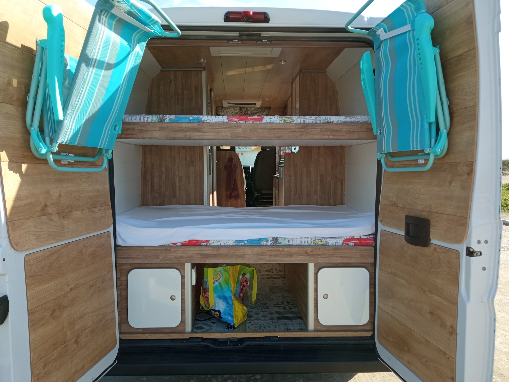 Equipamiento Camping vehículo: Techo alto, Wc químico,baño, Cocina, Nevera, Asiento Giratorio, placa solar 200w, batería de de gel,calentador agua caliente, cocina, ducha exterior.