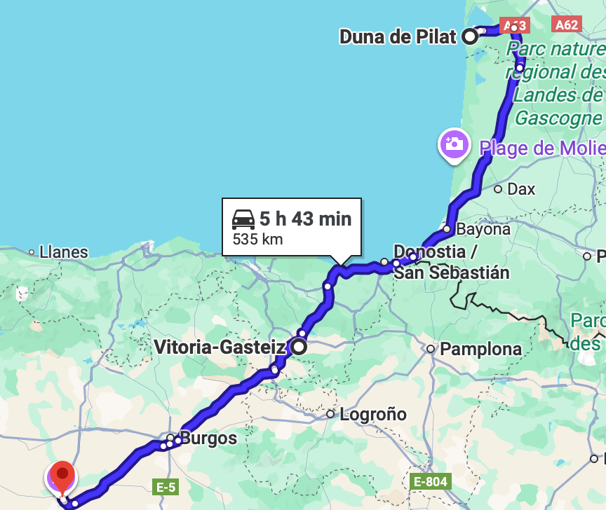 Acabo de recoger todo y me marcho sobre las 10:40h. Pronto dejo de tener la duna a la vista y cojo carreteras atascadas en dirección Bayona. El tráfico aligera y se puede coger algo de velocidad. Voy haciendo kilómetros. De pronto, se mete una nube y cae un chaparrón tremendo. Al rato sale el sol y está bien picajoso.