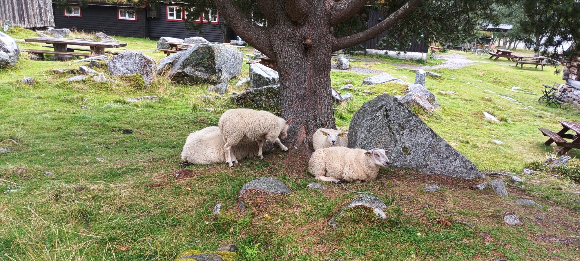 Me instalo con una música atronadora de fondo. Al rato vienen los dueños del camping con una carretilla llena de tartas. Quieren compensar a los campistas por el ruido de los vecinos. Un detalle, la verdad. Cojo un trozo de tarta de cereza y acabo de poner oscurecedores y sacar mesa. Aprovechando que tengo el postre, ceno y luego me doy una ducha. No he visto camping más limpio y con más detalles.