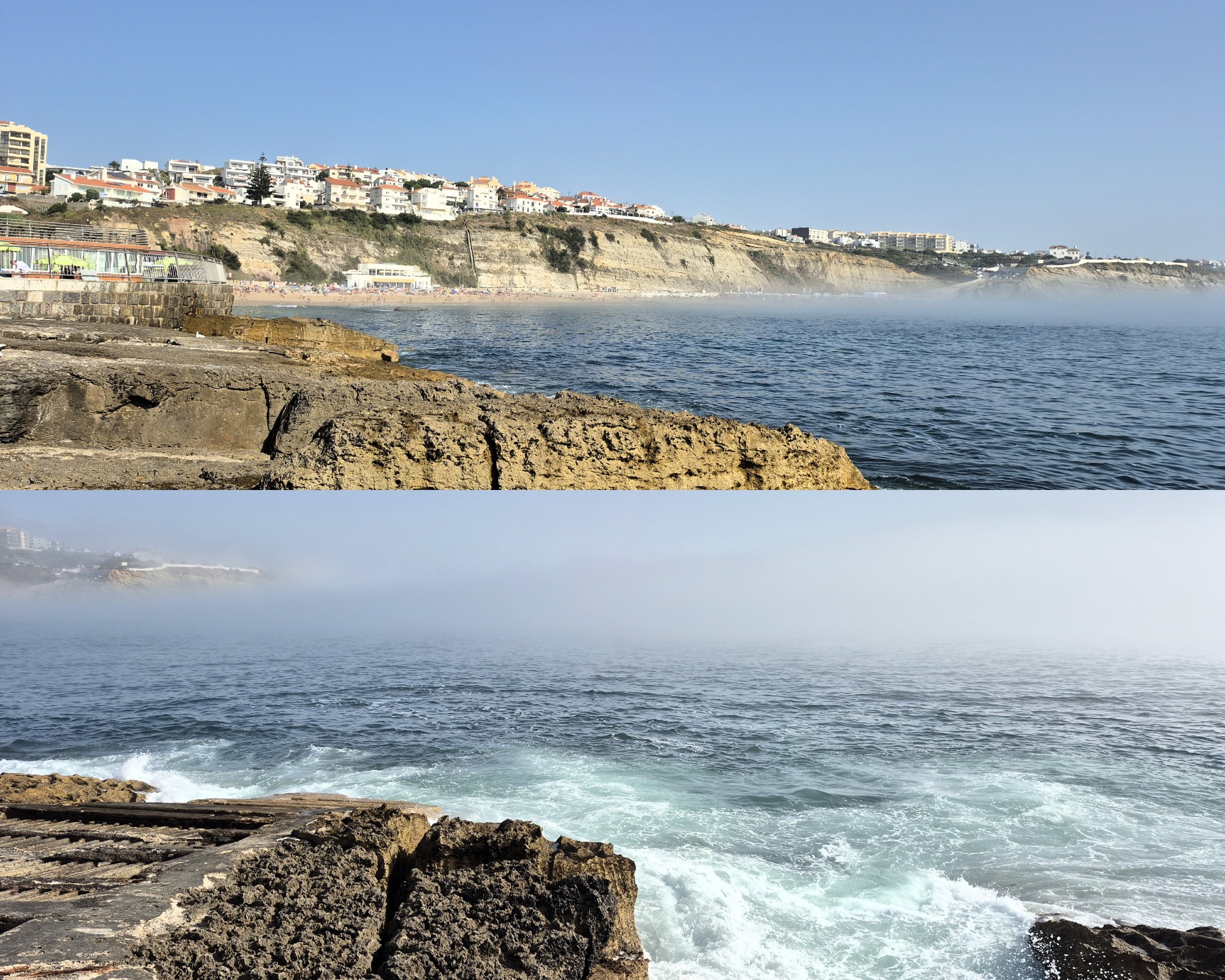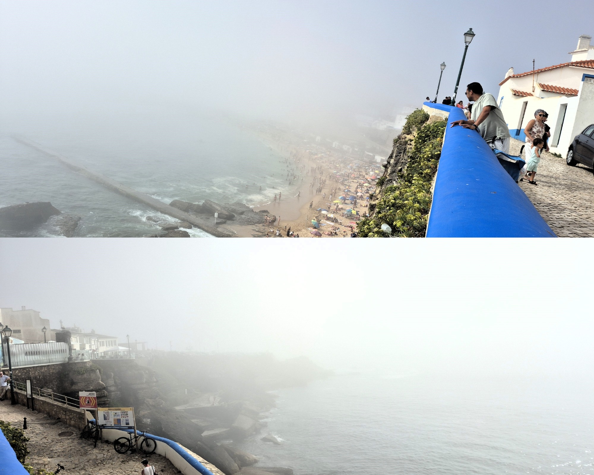 Por desgracia hoy es otro día más la bruma que no nos deja disfrutar del paisaje y la fuerza del océano.  Por lo que nos han contado en la sobremesa del restaurante, esto es causante por los días de mucho calor que ha habido anteriormente. Es como las galernas del Cantábrico pero sin que llegue a llover, la humedad se acumula justo delante de la costa y entra como niebla hacia adentro, a pocos metros de la playa el sol abrasa, pero en la playa aunque puedes bañarte y disfrutar del Sol está como nublado.