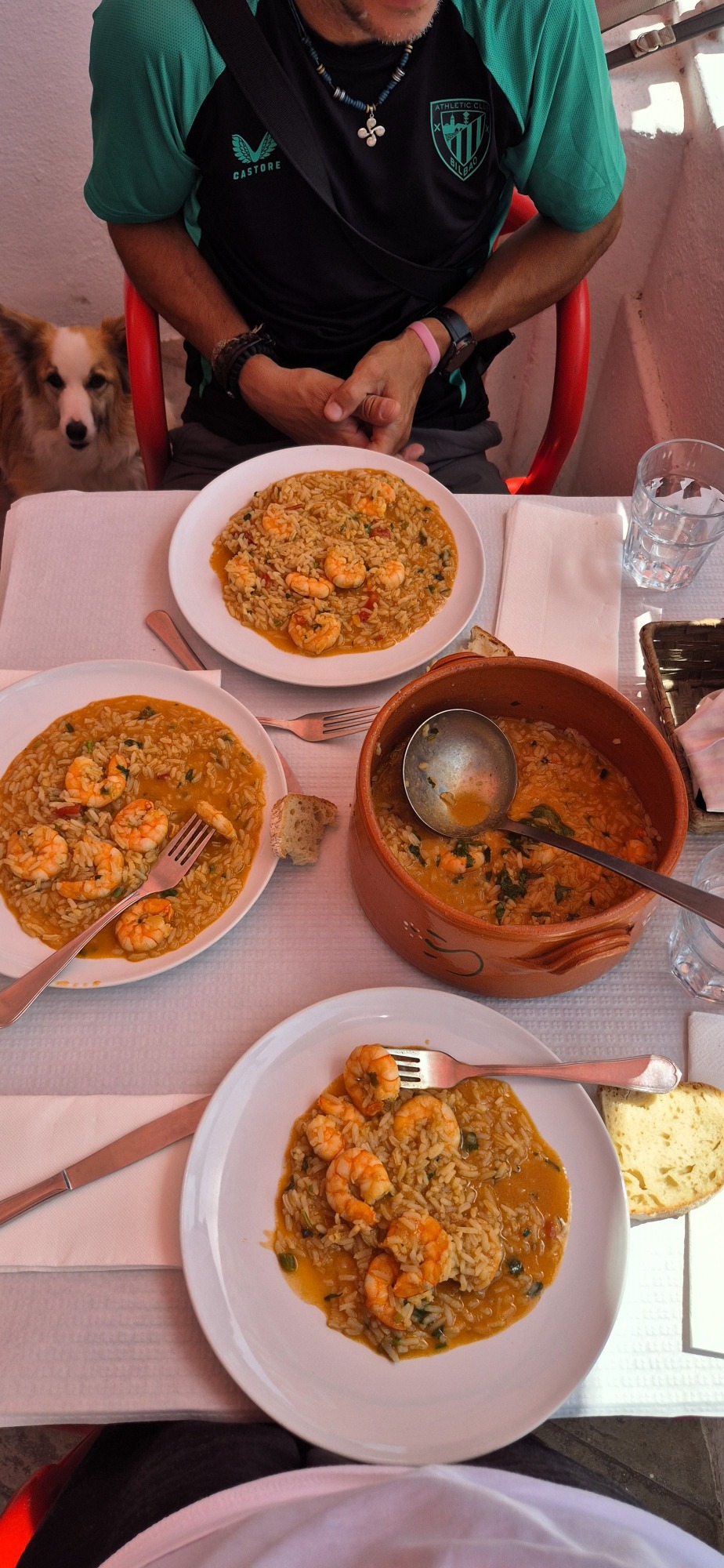 Como se está haciendo tarde paramos a comer arroz tamboril con langostinos antes de llegar a Ericeira. Pensamos que en los pueblos anteriores sería más barato y sin querer acertamos. Comemos barato, rico y nos tratan de maravilla. En casa Rodríguez en Ribamar. En la terraza, con la perra a nuestros pies, fue una gran experiencia culinaria.