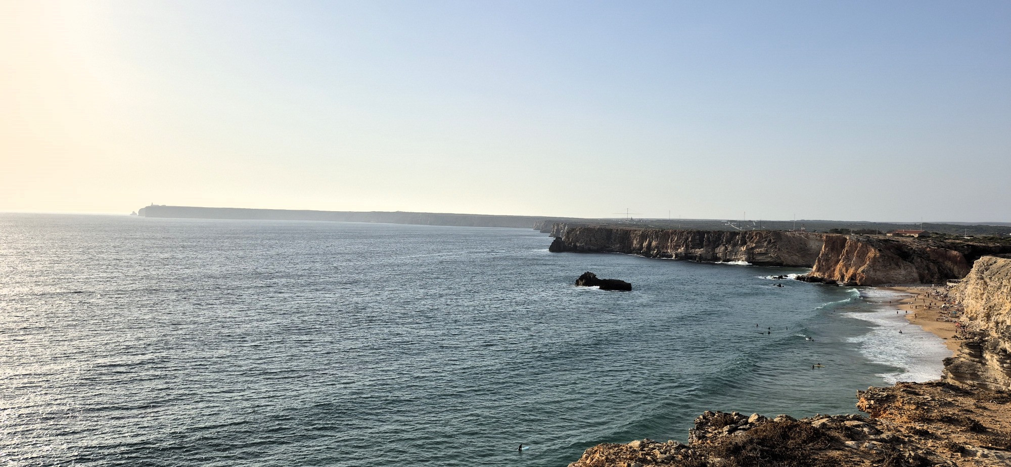 Dejamos una mesa y una silla guardando la plaza y nos vamos a visitar Sagres. La punta más al suroeste del continente, esculpida por el océano, que ha creado unos acantilados escarpados e imponentes, que caen a plomo más de 70 metros sobre el agua y están salpicados de playas donde los surfistas cabalgan las olas, siempre pendientes de mareas y vientos para moverse entre ellas, lo que les permite surfear casi todos los días del año.