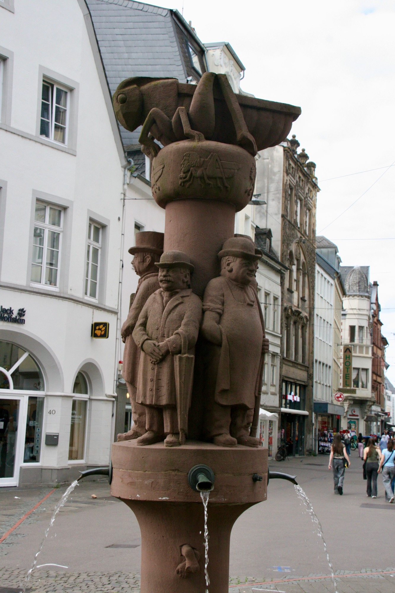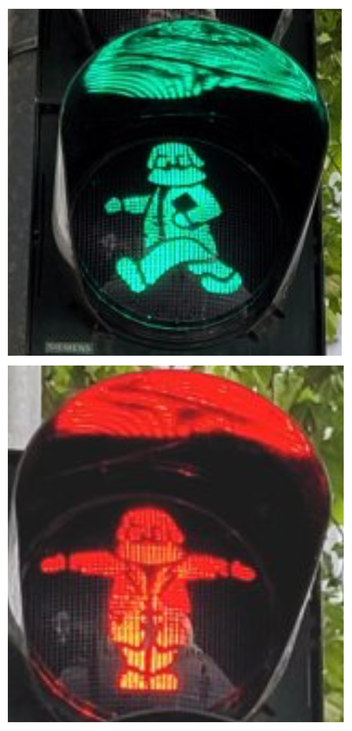 Antes de salir de la zona céntrica pasamos por la casa natal de Karl Marx. Junto a ella hay una plaza con una curiosa fuente y unos semáforos que nos sorprenden. Los típicos peatones en verde y rojo han sido sustituidos por la silueta de un Karl Marx verde caminando y otro rojo parado con los brazos en cruz.