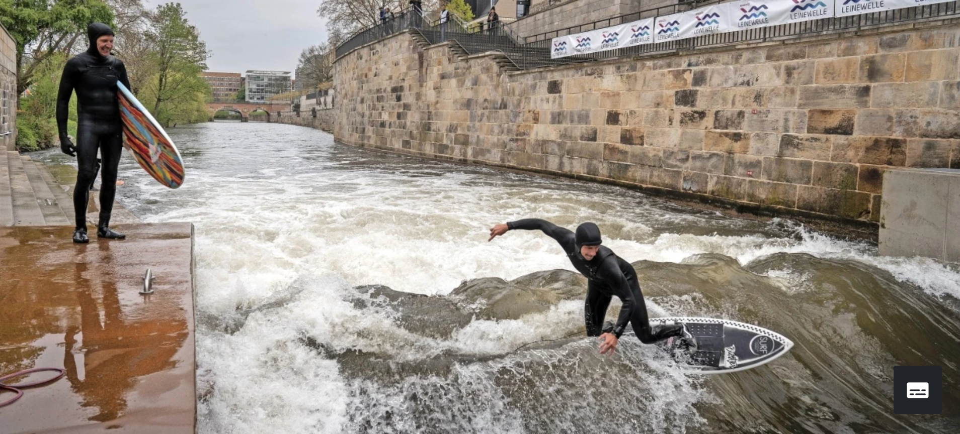 Eso sí, siempre hay algo nuevo por descubrir. Tras varias visitas a esta ciudad, esta es la primera vez que presenciamos el surf urbano en la ola artificial de Leinewelee. Mi mujer ya lo había visto en Berlin, pero para mi es la primera vez y me parece curioso. La cosa es que después he leído que la de Leinewelee es una de las primeras olas fluviales de Alemania.