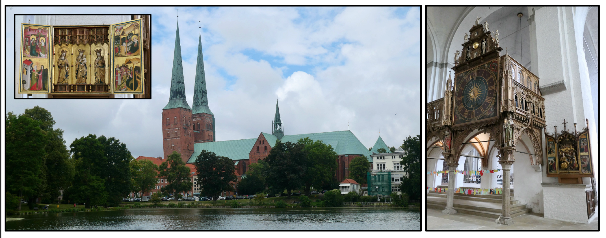Lo primero que nos encontramos es la Catedral, con sus dos torres gemelas y construida en ladrillo rojo, típico del gótico báltico. La Dom es la más antigua de las iglesias medievales de Lubeck y su interior, totalmente encalado en blanco, no nos parece nada extraordinario. El altar se ubica en en el centro del crucero y, tras él, destacan un enorme crucifijo y un bonito reloj cuya presencia nos parece muy curiosa en un lugar tan prominente de una iglesia. También hay algunos bonitos trípticos.