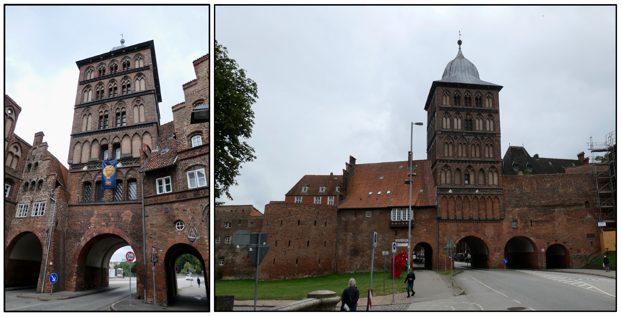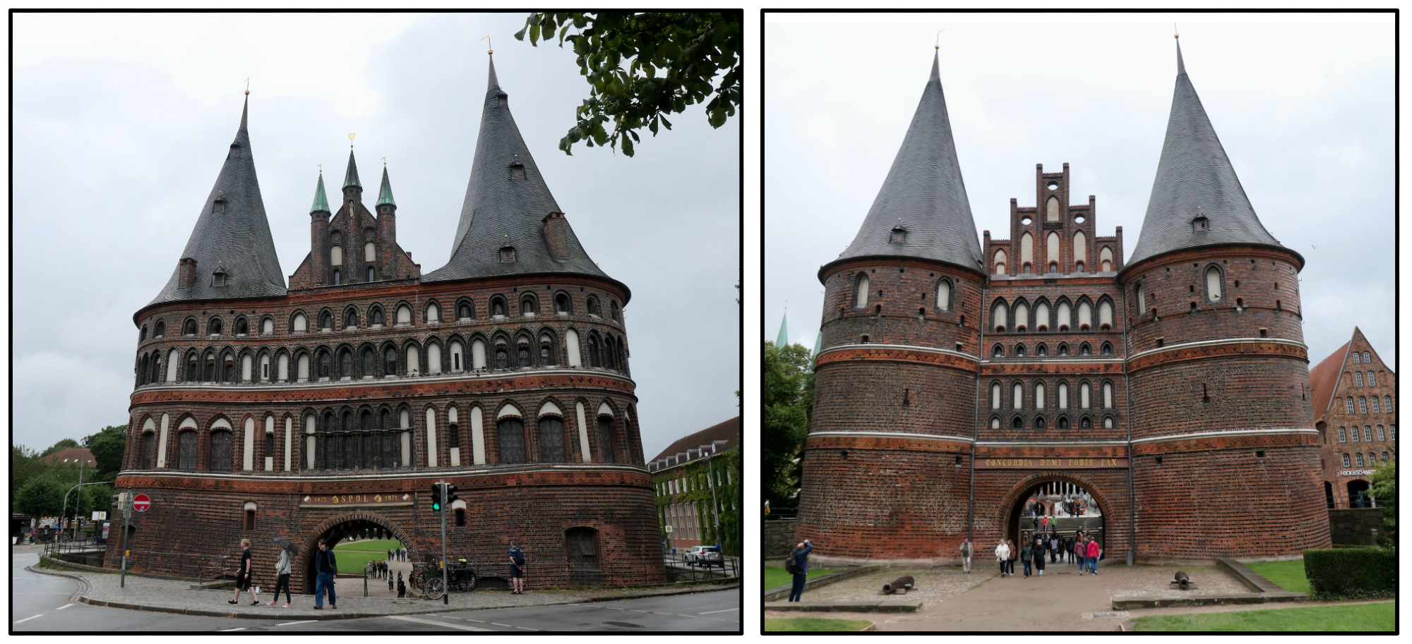 La puerta se halla al otro lado del río y justo pasado el puente que cruza el río Trave, en una lengua de tierra que no deja de ser otra isla estrecha y alargada. Suponemos que la Holstentor es parte de la muralla que protegía el acceso por ese puente. Y, aunque hoy día destaca por su elegancia, su misión defensiva resulta evidente por los dos sólidos torreones que flanquean la entrada. Torreones que están coronados con unos enormes kukurutxus al estilo exin castillos (sí, ya lo sé, soy un carroza).