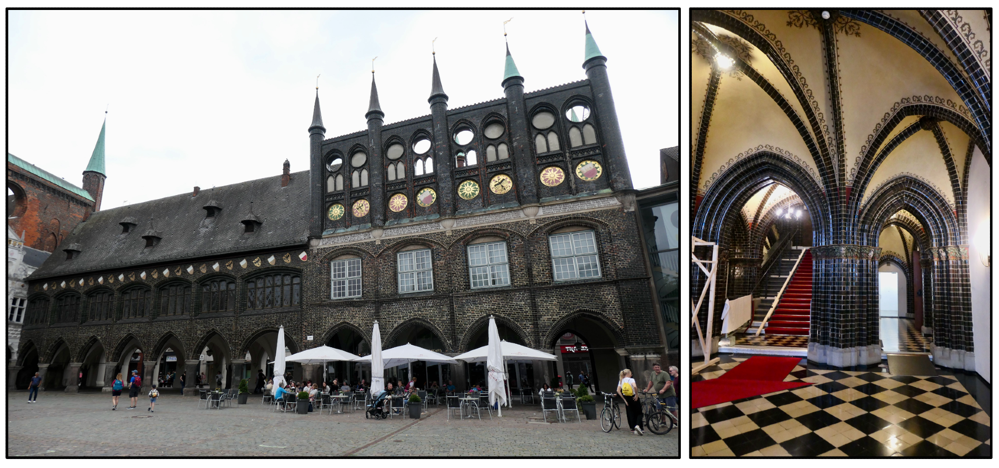 La Markplatz es el centro neurálgico de Lubeck y, sin duda, uno de sus mayores atractivos. En una de sus esquinas se levanta el ayuntamiento o Rathaus, a caballo entre ella y la Breite St., las cuales une a través de un paso arcado. Nos parece un edificio curioso, mayoritariamente construido con ladrillo negro y con un hall ciertamente llamativo.