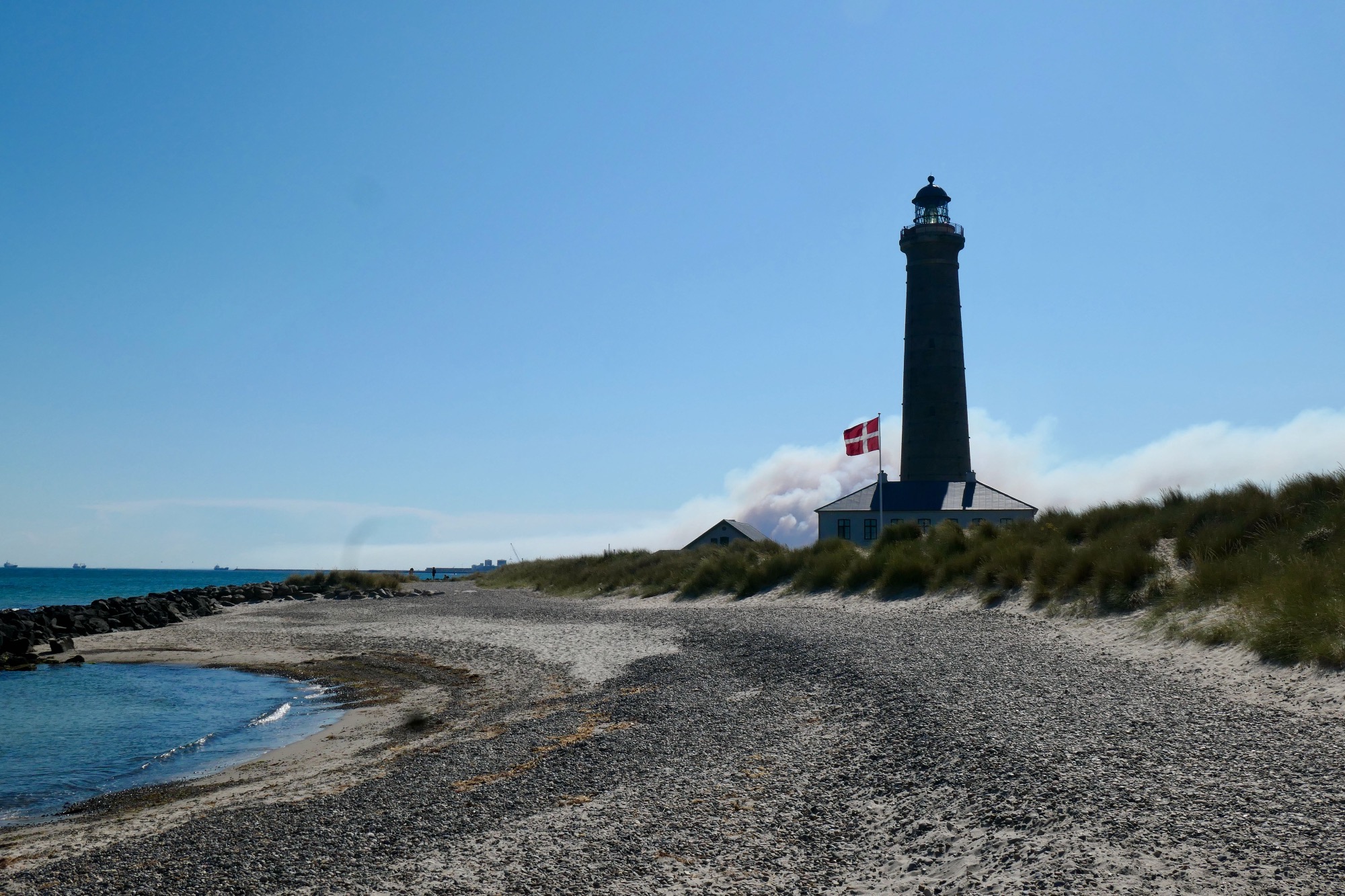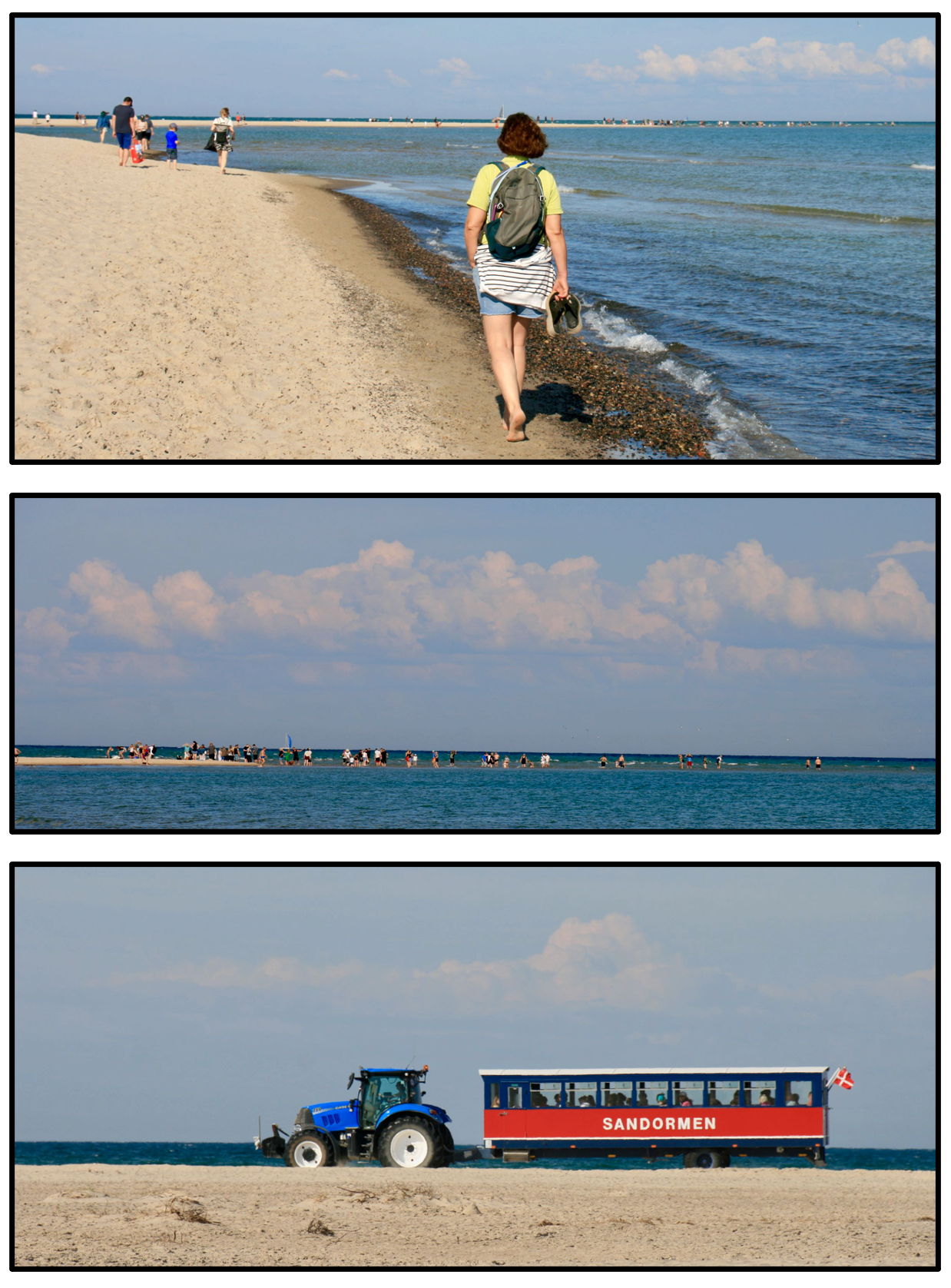 Tras reposar la comida salvamos los escasos 40 kms que nos separan de Skagen y dejamos la furgo en un parking de pago junto al faro (aprox. 1 €/h). Veníamos pensando en hacer una ruta larga que pasa por varios puntos de interés en la zona, pero entre pitos y flautas nos ponemos a andar pasadas las 17:00. Así es que lo dejamos en un paseo por la playa hasta la principal atracción del lugar: la punta de Grenen. Un lugar que debe su fama a ser el extremo septentrional de la península de Dinamarca y punto de encuentro donde se juntan las aguas del mar del Norte con las del mar Báltico. También marca la frontera entre los estrechos de Skagerrak (el que separa Dinamarca de Noruega) y de Kattegat (el que separa Dinamarca de Suecia).