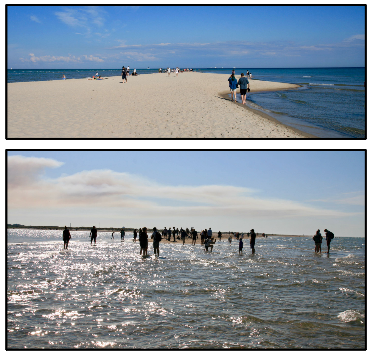 Cuando llegamos a la punta, nos mezclamos con el resto de turistas y nos metemos en el agua para caminar divertidos entre dos mares, mientras las olas que se forman nos golpean en las pantorrillas. La verdad sea dicha, no es un lugar espectacular por el que merezca la pena desviarse demasiado. No deja de ser una bitxikeria de esas que te llaman la atención cuando la lees. Pero es curioso ver como se juntan y chocan las olas que llegan de ambos lados, como si sus aguas lucharan por ganar espacio.
