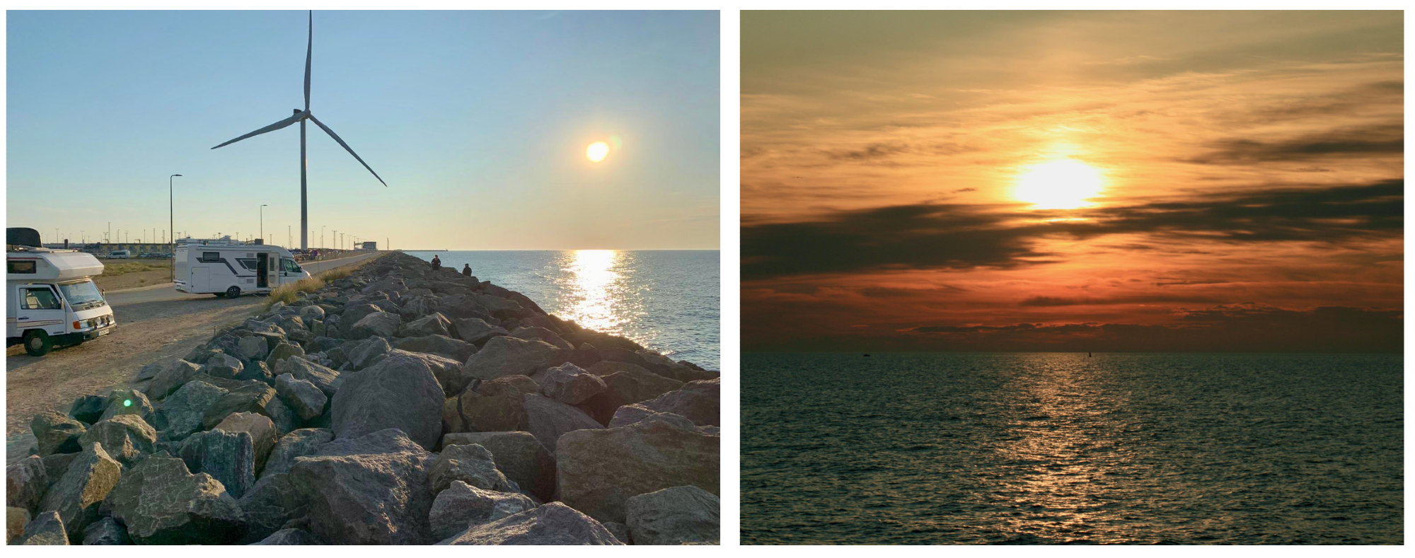 Pasamos por varias zonas donde hay vehículos aparcados y el sitio que más nos convence es el último parking de tierra bajo los molinos de viento. Así es que allí nos quedamos junto a unas cuantas furgos y ACs más a pasar la noche previa al embarque. Estamos en primera línea de mar, separados de él por las rocas que forman un rompeolas. Hoy hace buen tiempo y no corre el viento, por lo que nos parece un buen sitio.