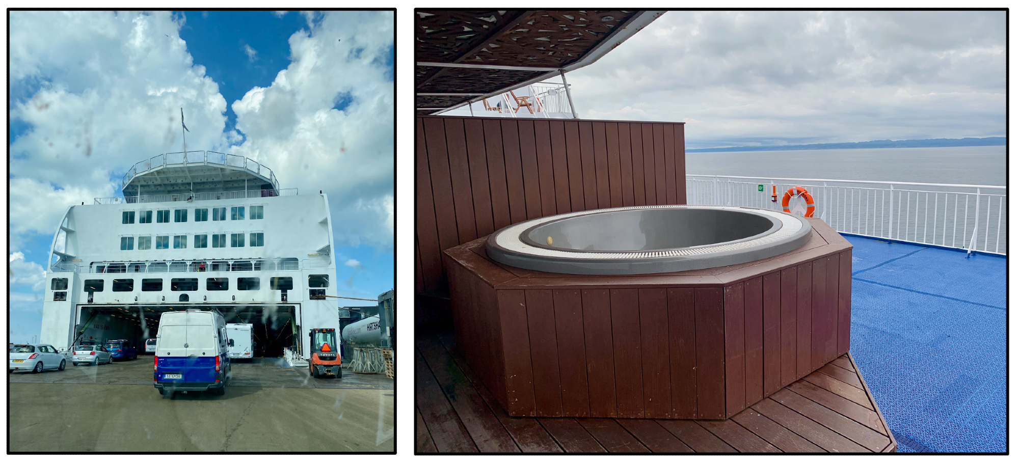 Al de un buen rato, empieza el movimiento en las primeras filas y todos corremos nerviosos a nuestros vehículos. Embarcamos! La cosa va más o menos rápida y caemos en la cuenta de un cambio respecto al 2015. Entonces no permitían que los pasajeros subieran al ferry en los vehículos. Salvo el conductor, todos tenían que subir por la pasarela de peatones. Mientras que ahora todos vamos dentro de nuestros vehículos. Debe de ser porque han mejorado la organización del embarque. Hoy ha sido más rápido y dentro del ferry todo ha ido fácil. En el 2015 lo recuerdo como un bonito follón, con los vehículos maniobrando en la bodega y con esperas para que te ubicaran en tu sitio. Además, aun siendo pequeño, el espacio entre uno y otro es ahora bastante mayor. Similar al de cualquier otro ferry que hayamos cogido. Nada que ver con lo de hace 10 años. Ahora dejan espacio para pasar entre los coches y no tenemos ningún problema en alcanzar la escalera y salir de la bodega. Ha sido mucho menos caótico.