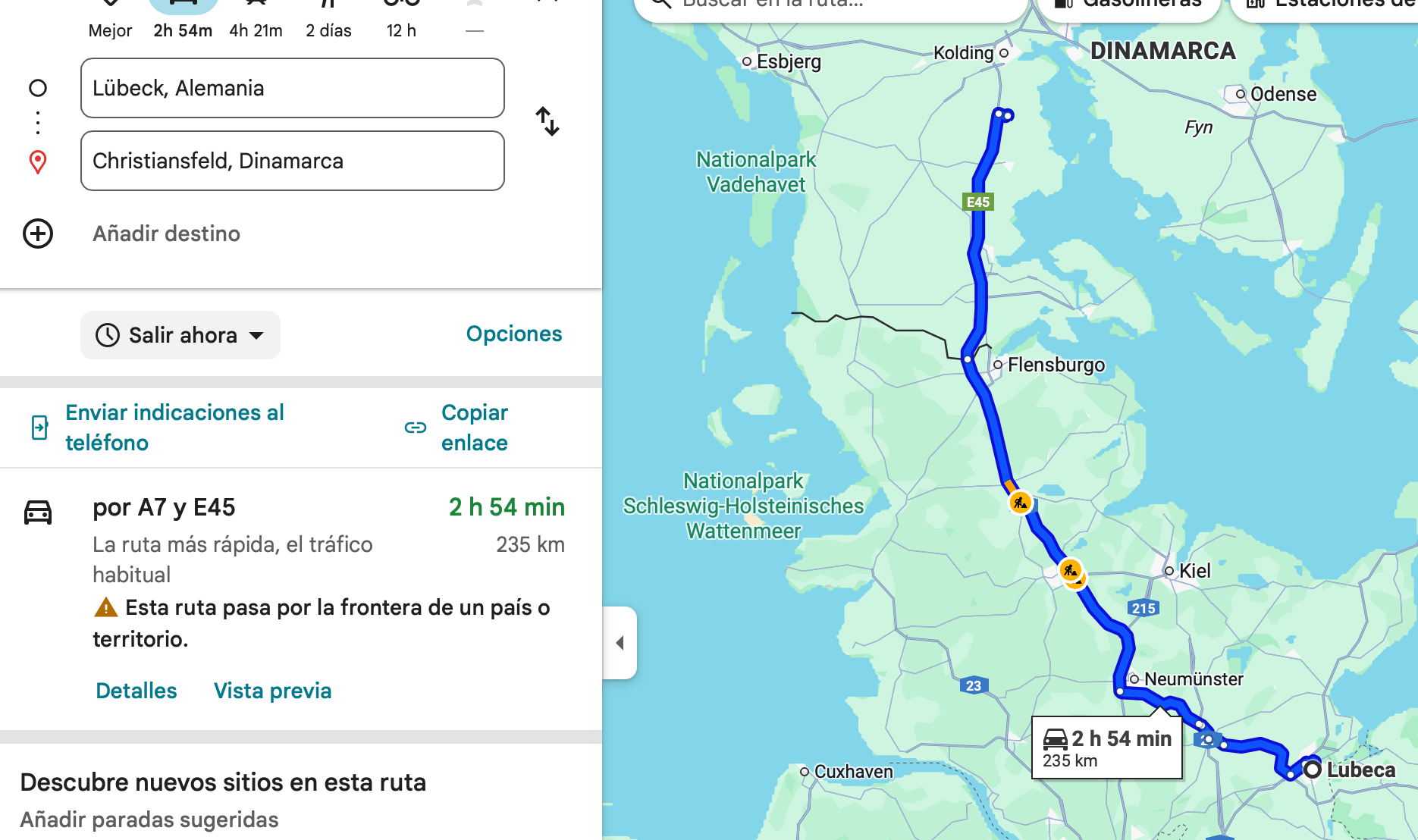 Como ya es hora, comemos en el mismo parking donde hemos dormido y nos disponemos a seguir haciendo kms. Así llegamos a la muga con Dinamarca, donde circulamos también por autopista gratuita y con tráfico fluido. Sin retenciones que nos hagan perder tiempo. La verdad es que las veces que hemos atravesado este país siempre ha sido así. Y ya van tres veces para arriba y otras tantas para abajo. Por lo que tengo una muy buena impresión de la red viaria danesa.