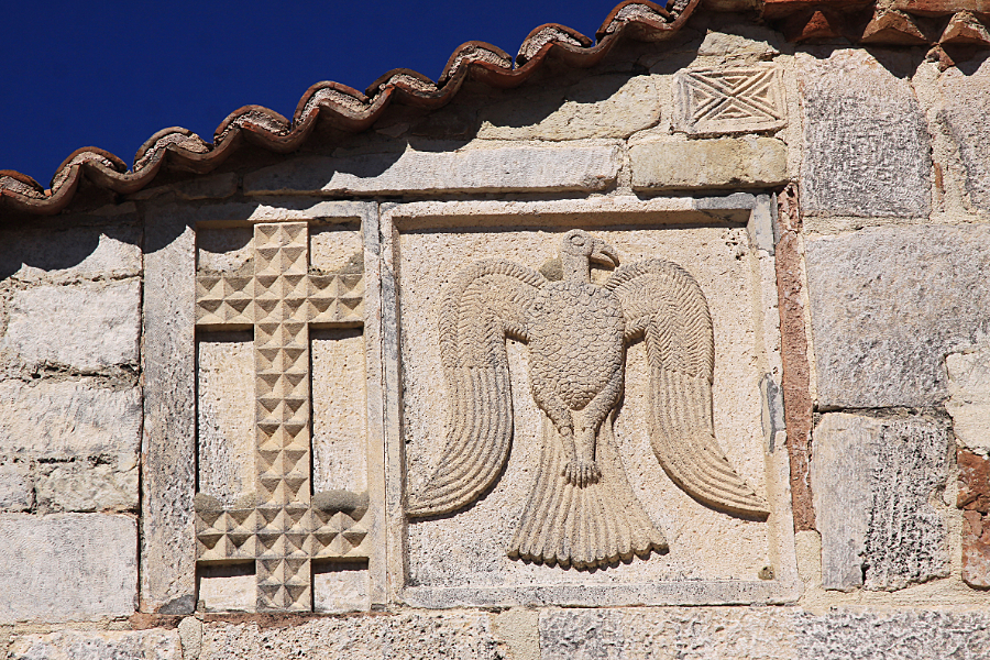En un muro hay un relieve con un águila monocéfala. Éste era el símbolo romano tradicional que representaba el poder, la autoridad y la conexión con Júpiter (o, en su versión cristianizada, con Dios). Era el símbolo de las legiones y del estado romano y sin duda fue usado profusamente durante el reinado de Justiniano, por ejemplo en monedas y estandartes. También existe al águila bicéfala, que simboliza la soberanía dual y universal del emperador Justiniano sobre Oriente y Occidente. Representaba el dominio sobre el mundo cristiano y la idea de que el emperador era el vicario de Dios en la Tierra. Es una declaración visual del sueño de Justiniano de reunificar el Imperio Romano.  Pero el águila bicéfala se consolidó como símbolo imperial bizantino después de Justiniano, aunque se le asocia a él porque fue quien mejor encarnó la idea que representa.