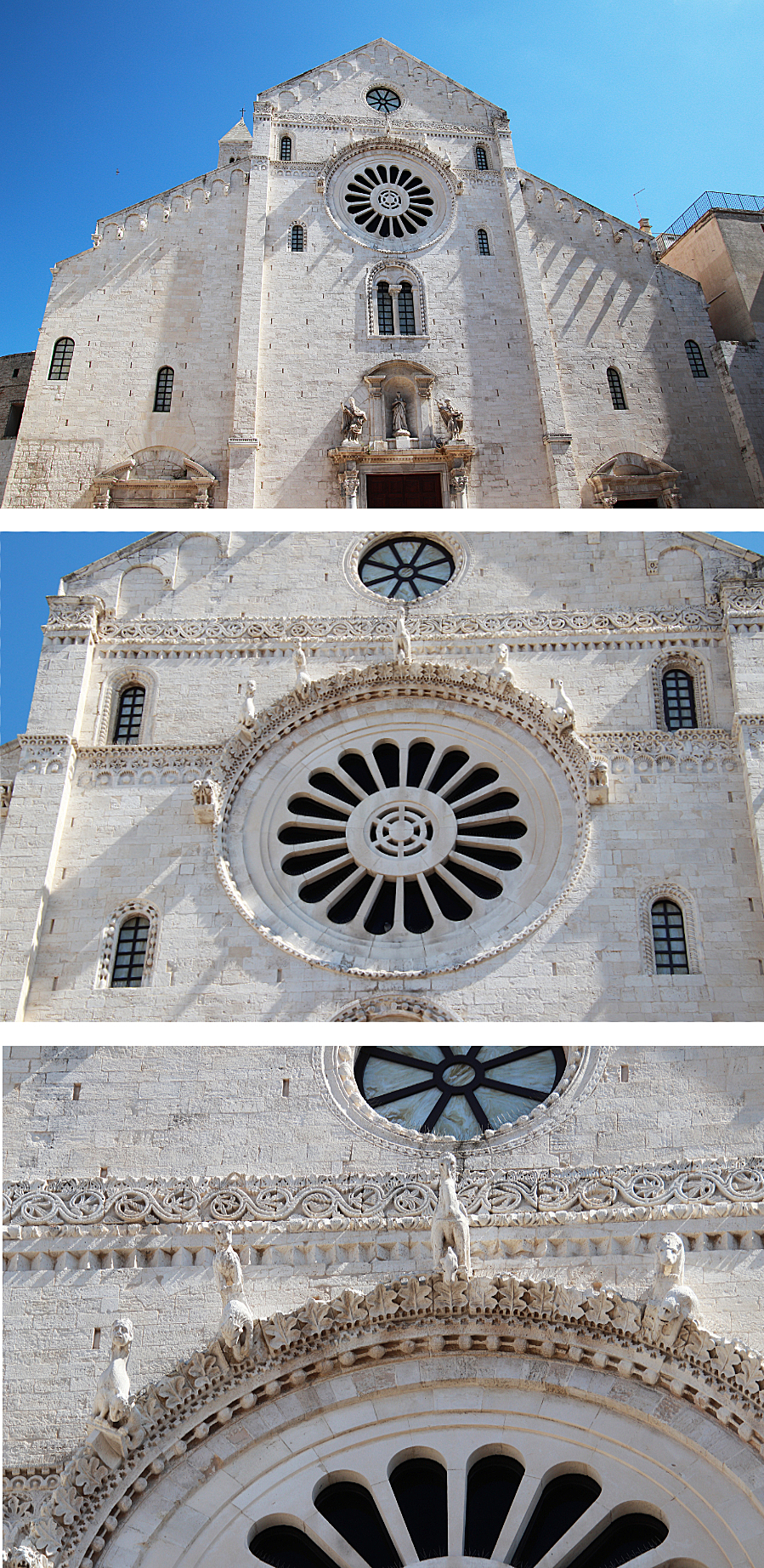Paseamos hasta la catedral por estrechas calles llenas de turistas comiendo en las terrazas de los restaurantes. En la catedral no entramos porque hay que pagar y hoy no tenemos ganas de pagar, además ya la vimos la primera vez que estuvimos en la Puglia. Pero sí me paro a hacer fotos de su fachada y de su magnífico rosetón