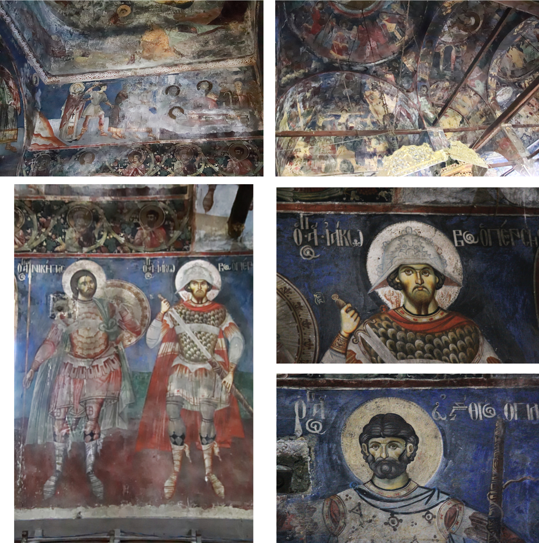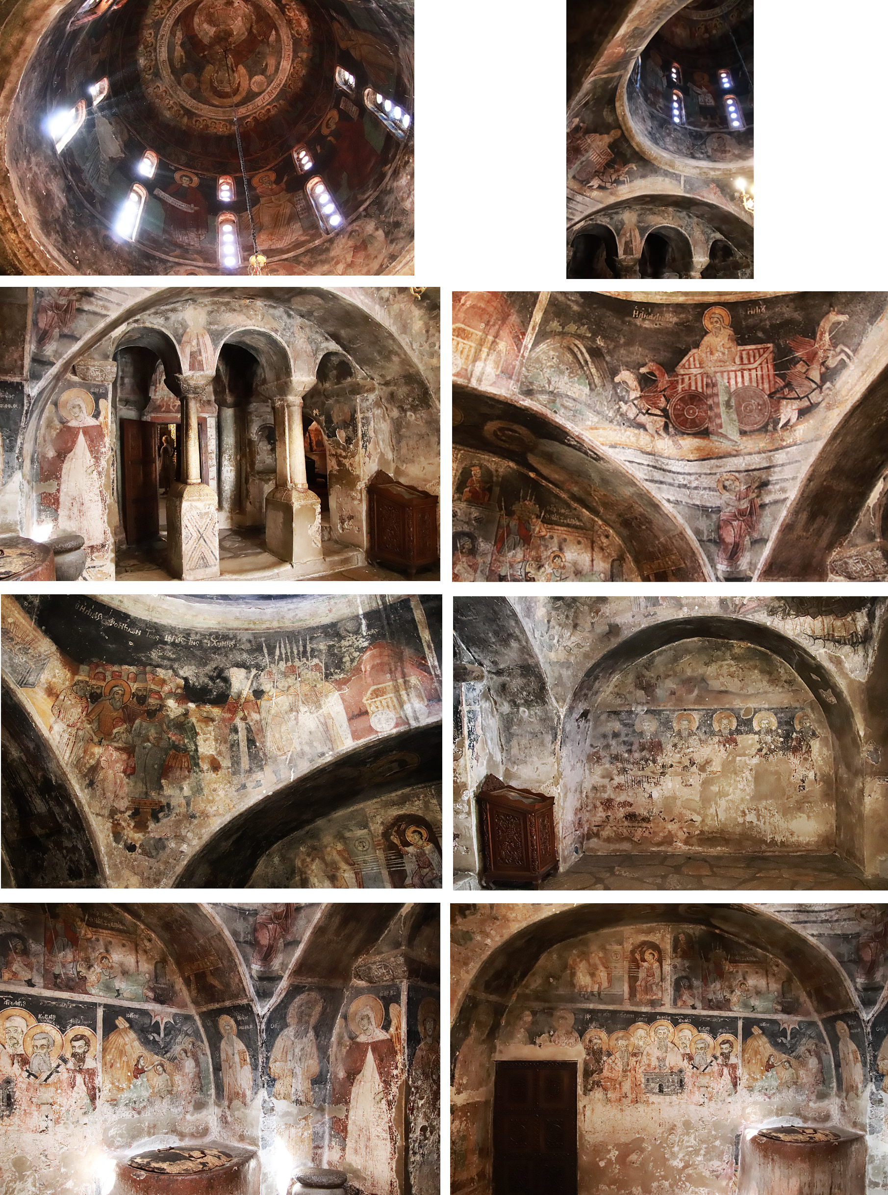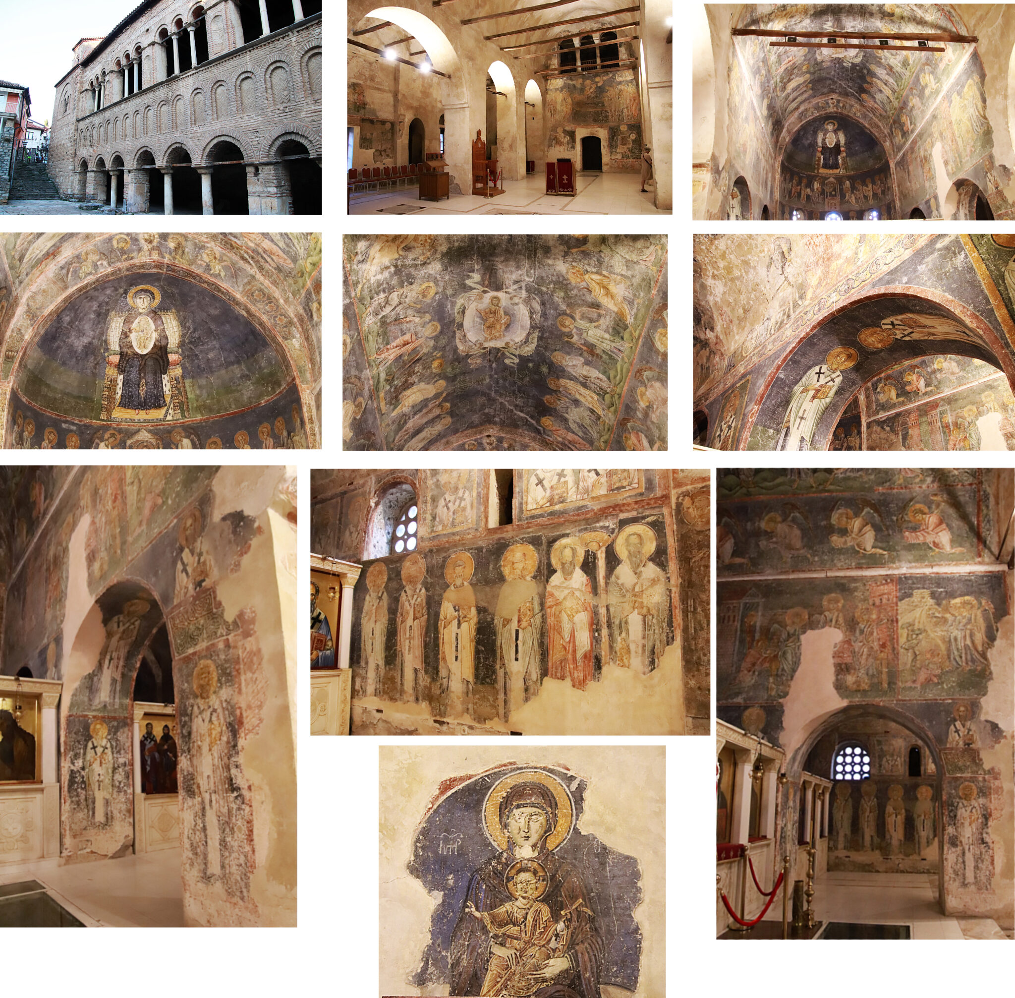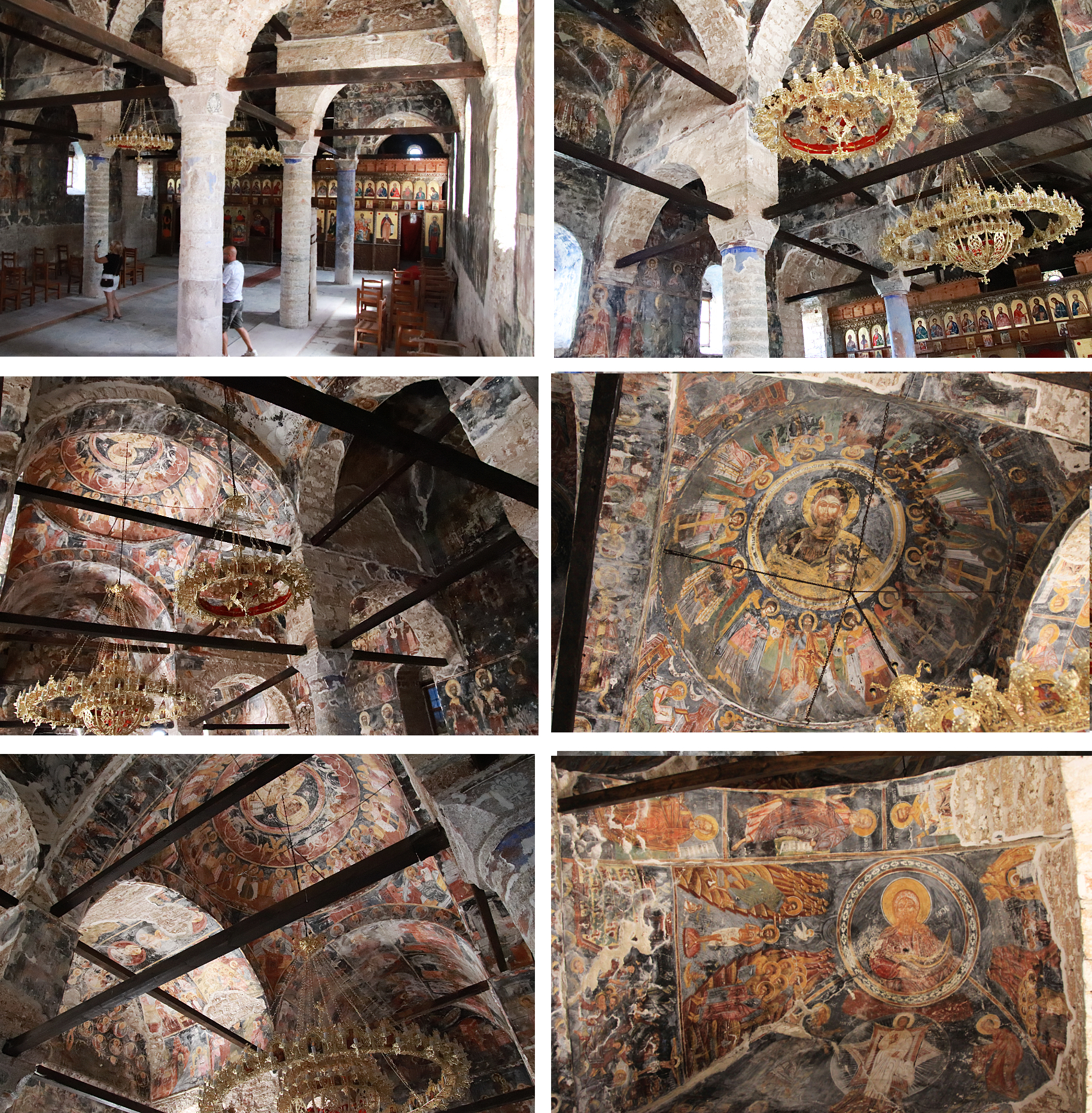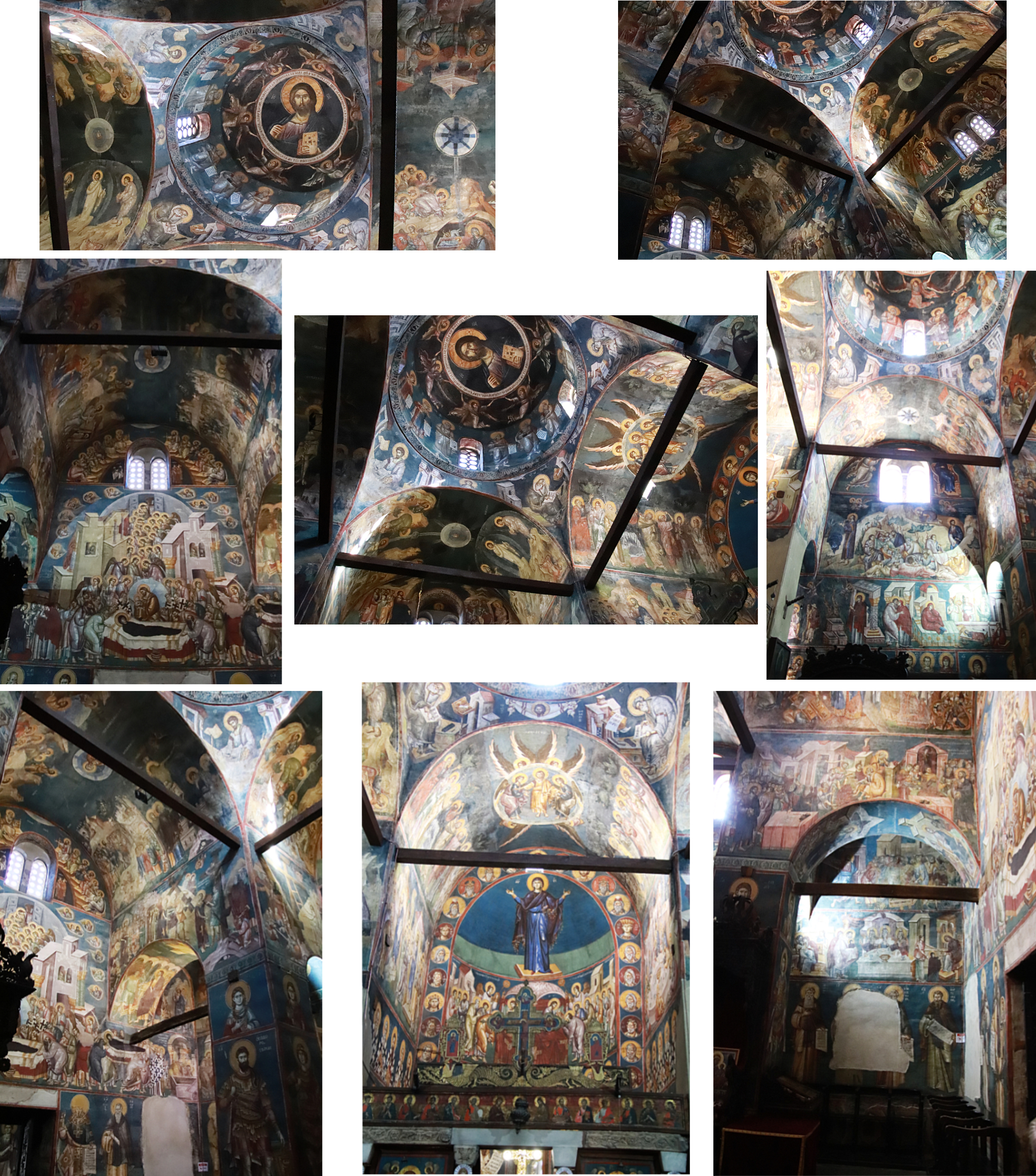 En su interior hubo hasta 20 iglesias, hoy en día quedan unas pocas. Primero visitamos la iglesia de Santa Sofía, una sencilla iglesia de planta cuadrada y reducidas dimensiones, construida alrededor del siglo XIII. En cuanto a los frescos, no encuentro buena información, lo mismo encuentro un texto que dice que esta iglesia no existe como encuentro textos que hablan del origen medieval de esta iglesia y dicen que las pinturas son del siglo XIII o XIV, pero no hace falta más que verlas para pensar que medievales no lo son en absoluto, yo diría que son mucho mucho más recientes.