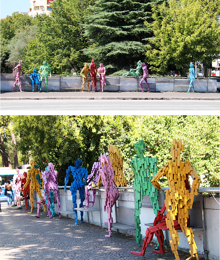 Seguimos el paseo y nos encontramos con la escultura «Transición» del artista albanés Helidon Haliti, una serie de figuras, realizadas con barras de acero pintado de colores, que se mueven en diferentes direcciones para  representar la transición de Albania de un régimen comunista aislado a un país moderno y abierto al mundo.