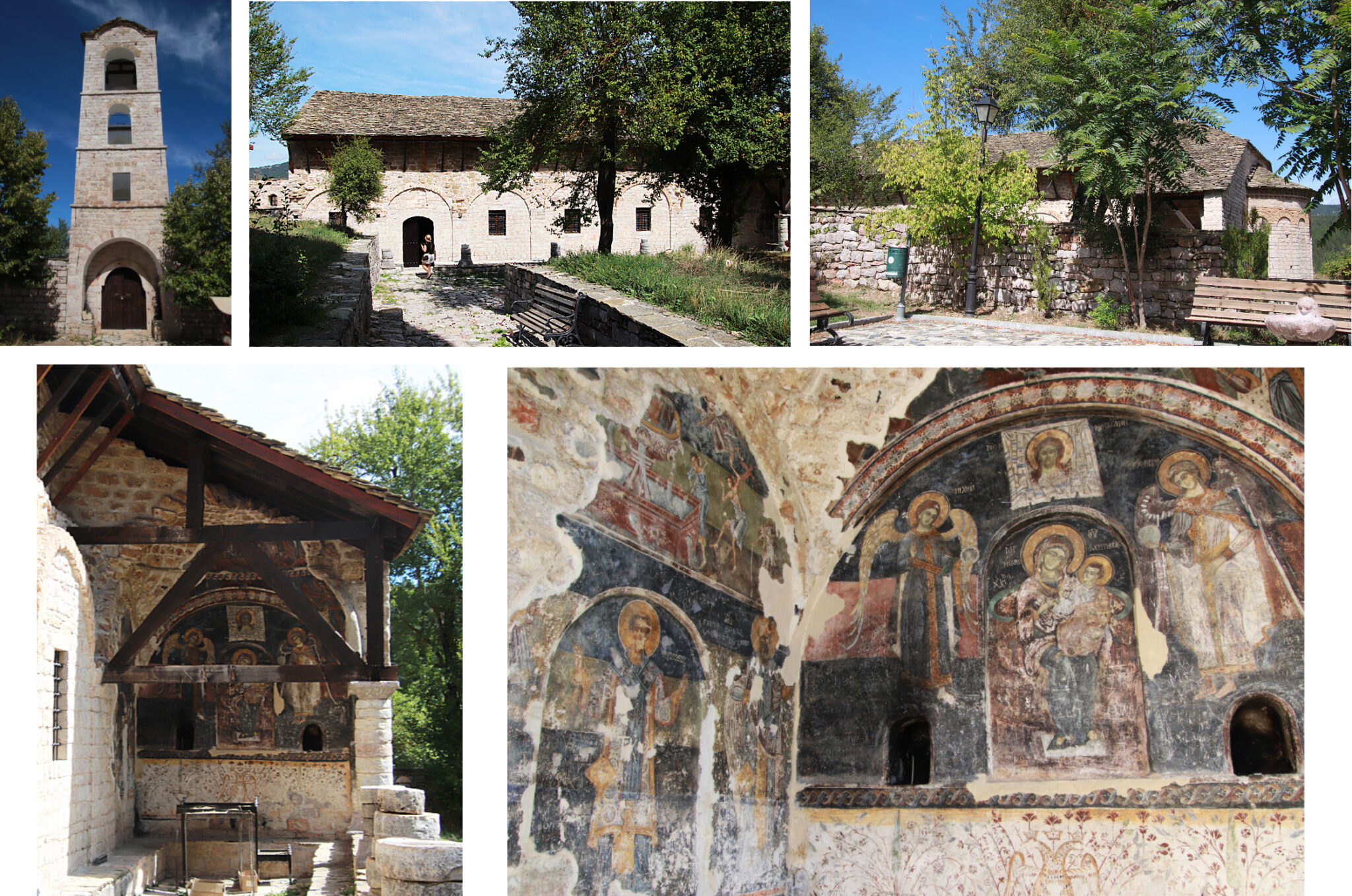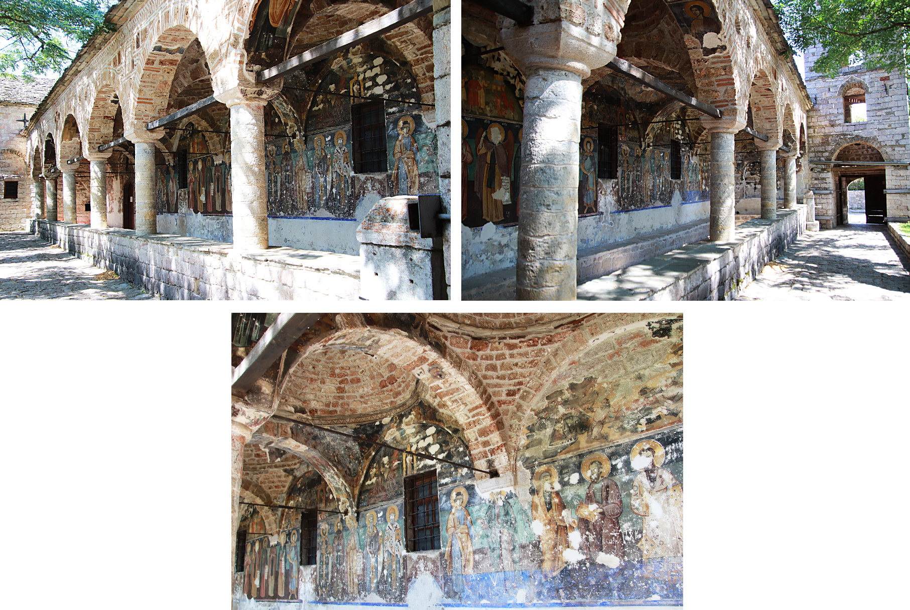 La primera iglesia que visitamos es la de la Dormición de la Virgen (hacia 1699). Es impresionante. Empezamos por el exterior. Leo que las iglesias bizantinas y postbizantinas (después de la caída de Constantinopla, 1453) no suelen estar pintadas en el exterior. Aunque sí hay ejemplos en Moldavia, Rumanía, etc. Pero en esta sí quedan restos de frescos en la galería exterior