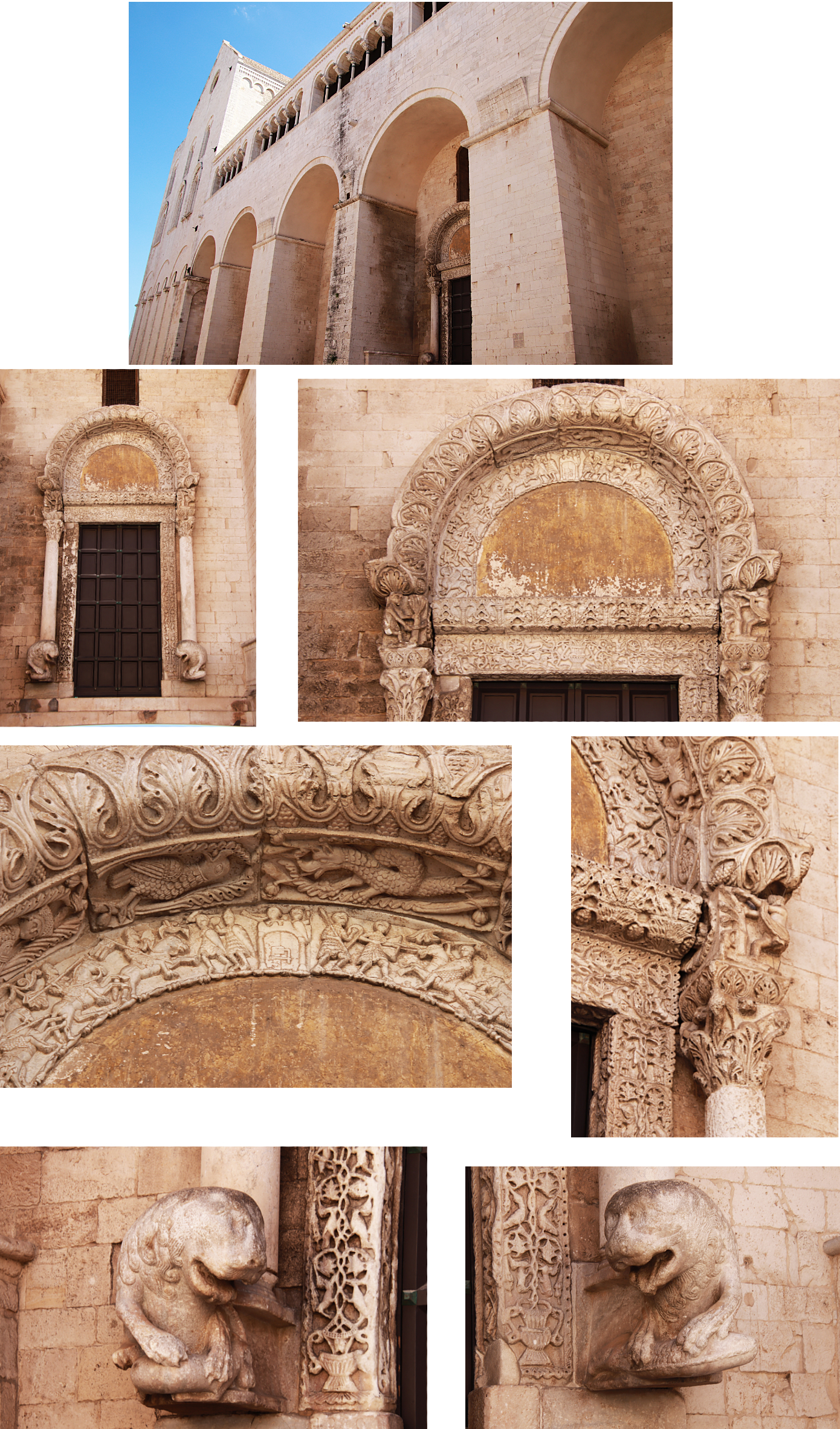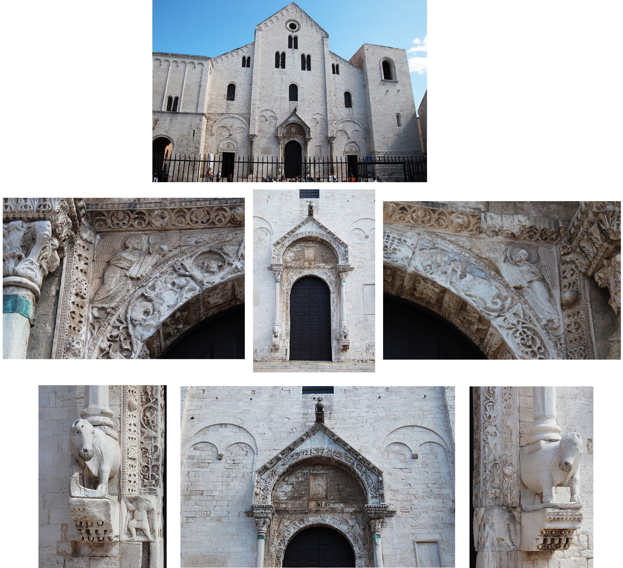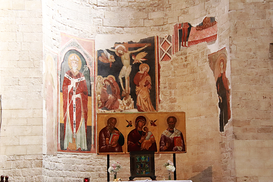 Vamos hasta la basílica de San Nicolás, en la que no hay que pagar y nos gusta mucho. Es un importante centro de peregrinación tanto para cristianos católicos como ortodoxos, como tendremos ocasión de comprobar, porque alberga las reliquias de San Nicolás. La basílica fue construida entre 1087, destruida en 1156 y reconstruida entre 1160 y 1197. Es un buen ejemplo de la arquitectura románica de Puglia. Tiene un aspecto macizo que se explica por su posición cercana al mar y la necesidad de ofrecer refugio durante los frecuentes ataques y parece más una fortaleza que una iglesia.
