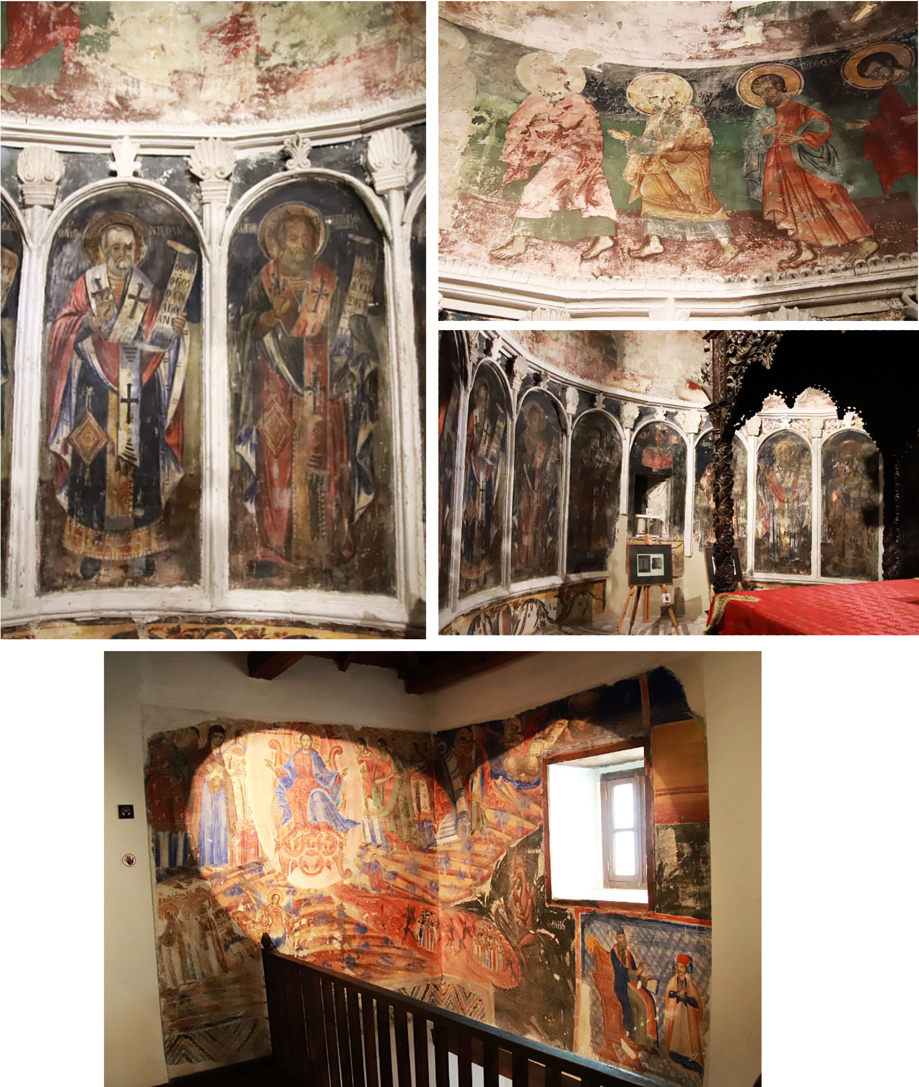 Tras el iconostasio vemos el ábside y la semicúpula que lo cubre, ambos decorados con frescos, lo mismo que la cúpula de la nave del templo y un fragmento de pared del primer piso. De estos frescos no encuentro ninguna información (alguna IA me ha dicho que no existen 😳) pero ahí están y su aspecto es de pinturas anteriores al siglo XVIII, momento de construcción de la iglesia. Imagino que son restos de la iglesia bizantina medieval sobre la que se construyó la que vemos hoy en día