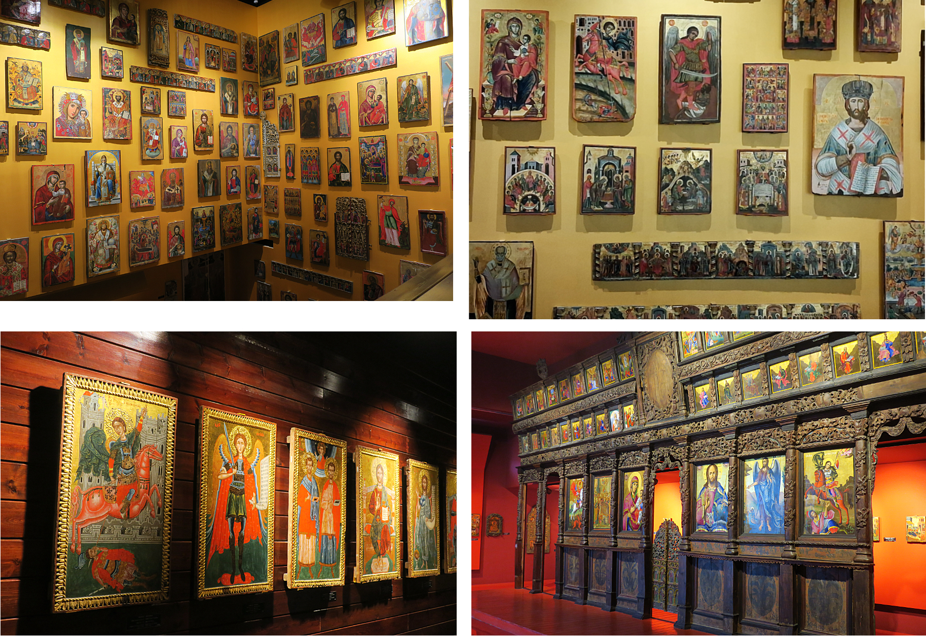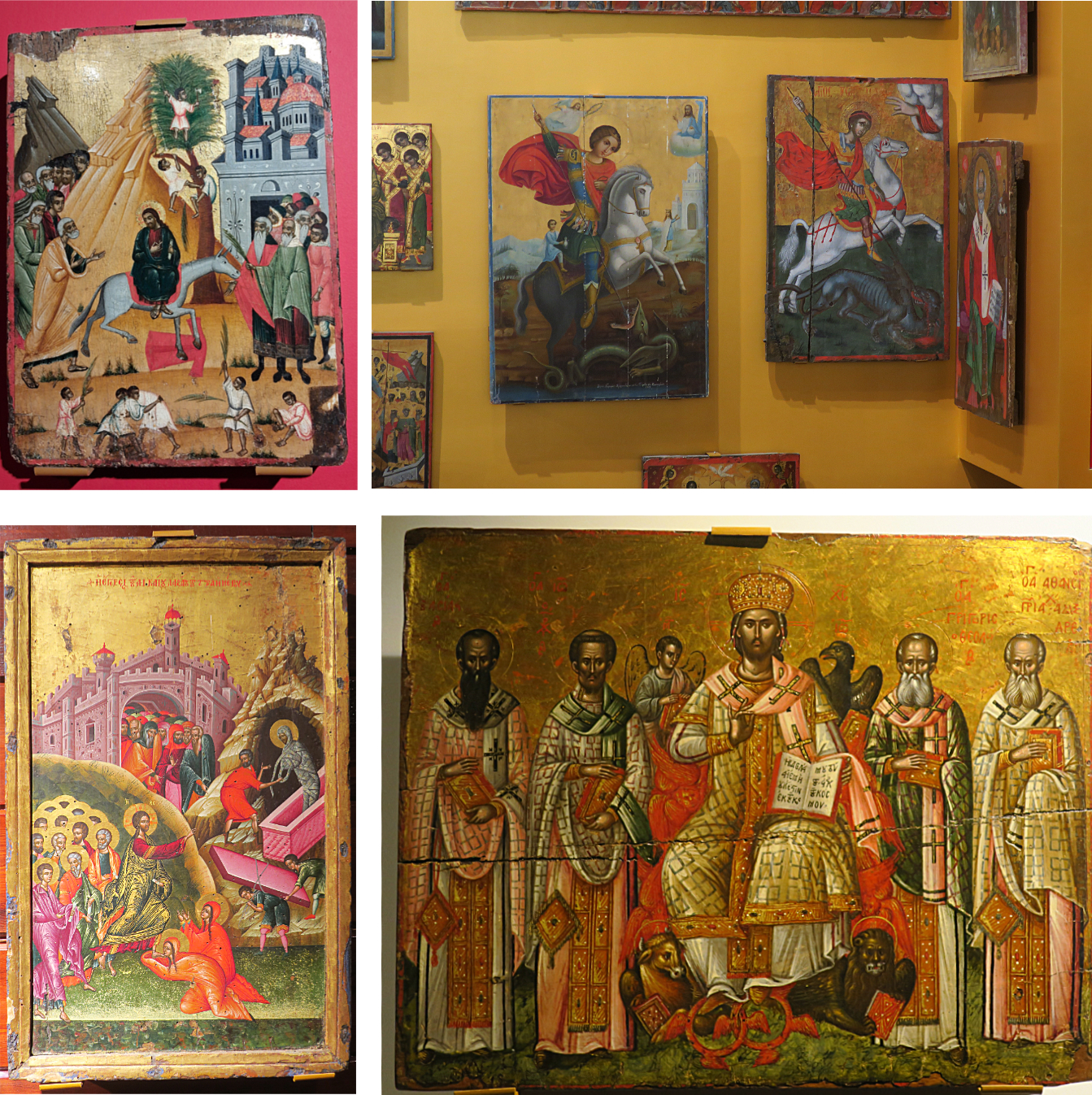 La colección del museo alcanza los 1500 objetos, que proceden de las iglesias y monasterios de Albania y de la ciudad de Berat, de los que hay expuestos 187. Nos llaman la atención dos iconos. Uno narra la Santa Cena con los Apóstoles reunidos alrededor de una mesa redonda no rectangular, como solemos verla, en el otro, bajo la Anunciación, aparecen San Jorge, montando un caballo blanco matando al dragón, y San Demetrio, sobre un caballo rojo y matando a Lyeo (el bárbaro que amenazaba a los cristianos de Tesalónica) como cuenta la leyenda del milagro. En ambos casos se representa el triunfo del Bien sobre el Mal.