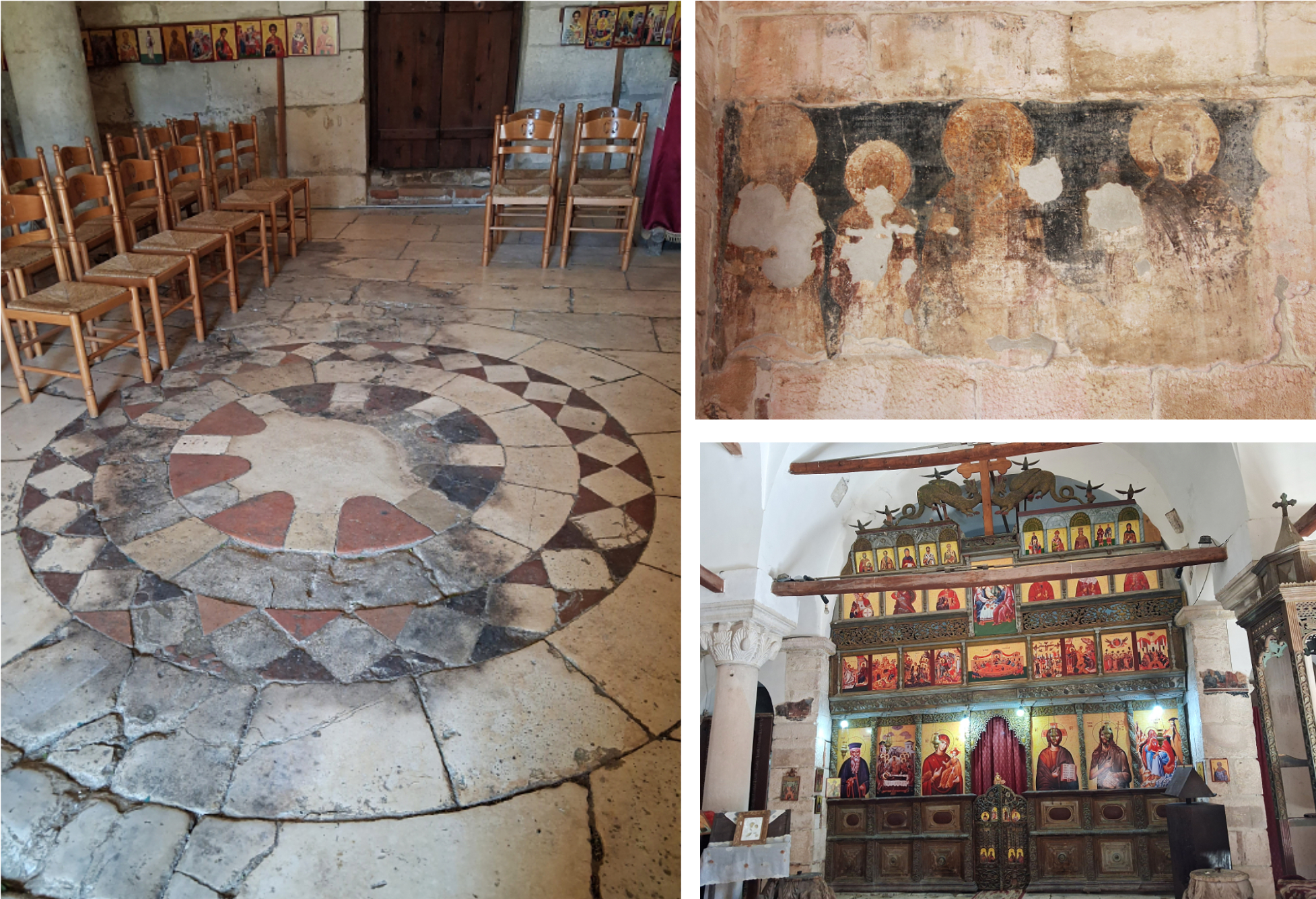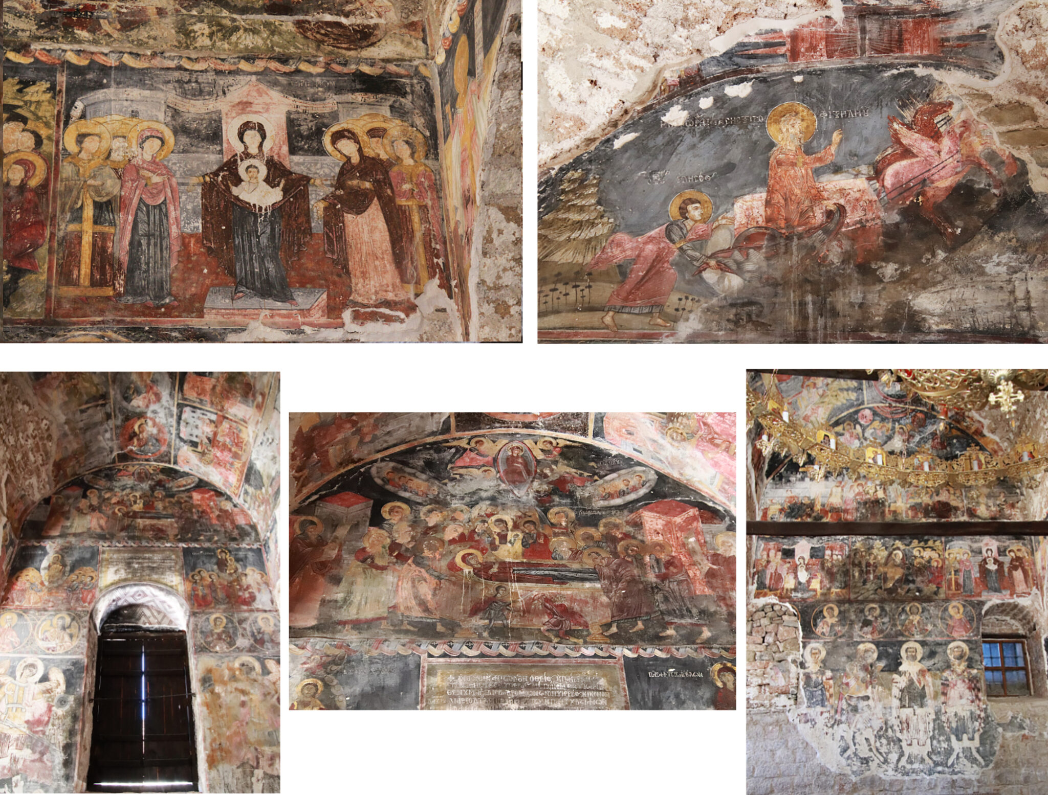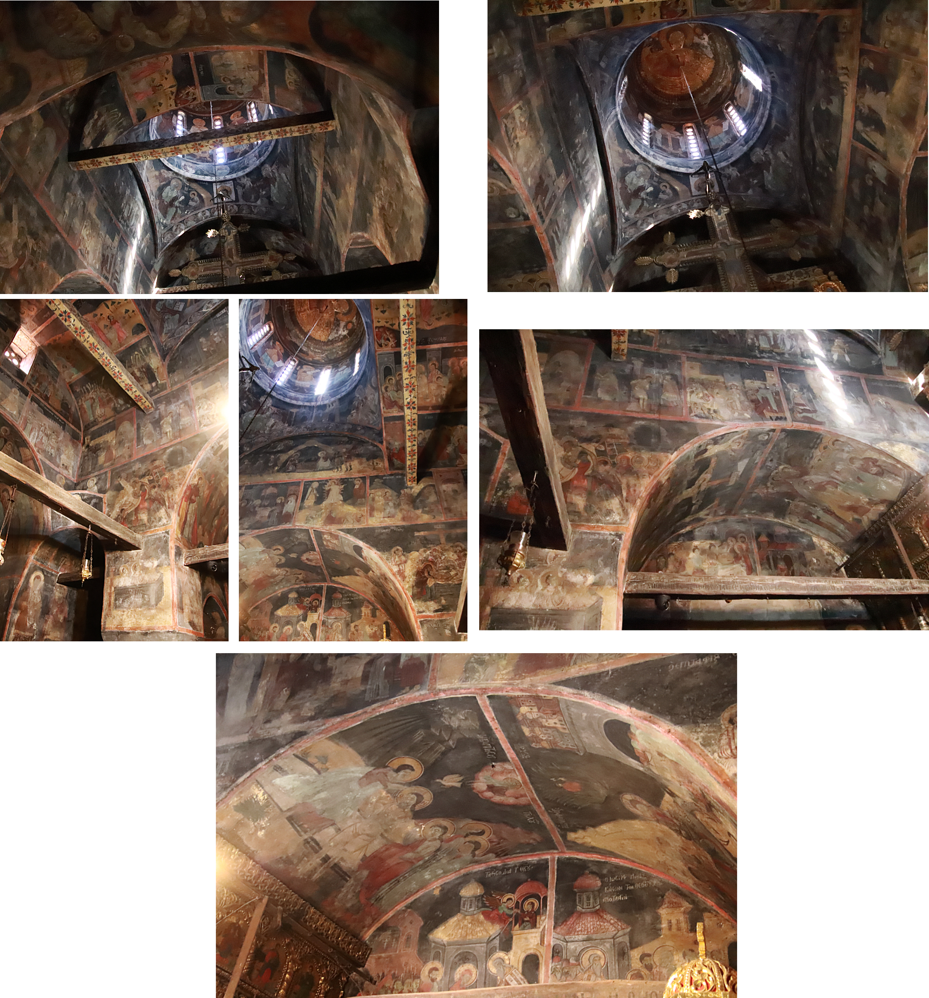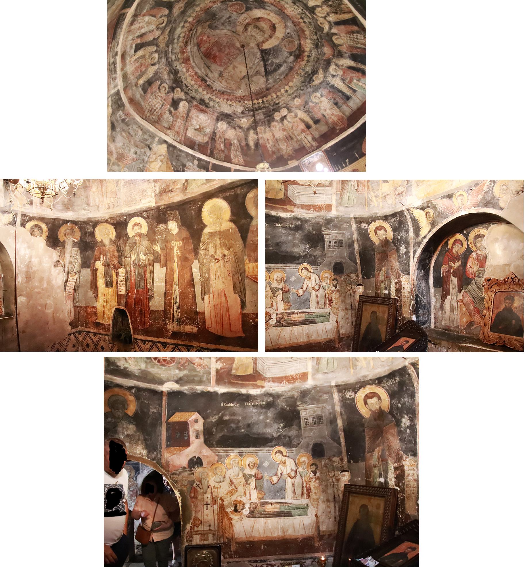 En el interior del antiguo templo pueden verse frescos originales conservados del período medieval y un notable iconostasio.
