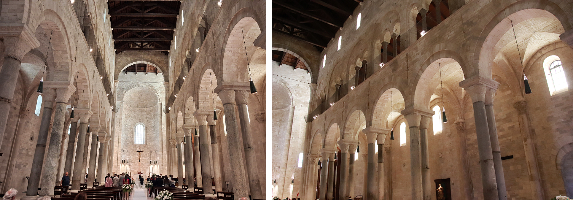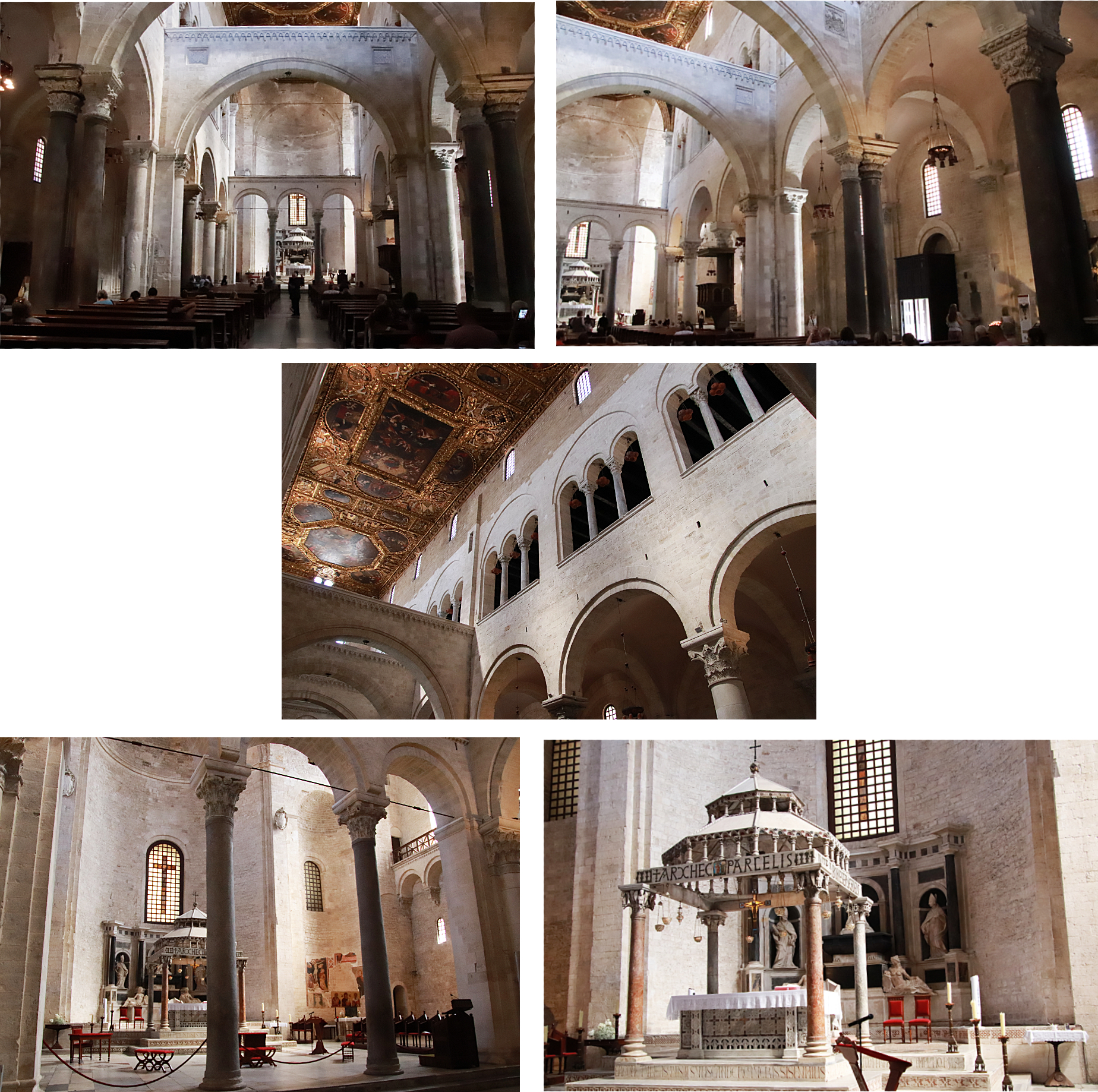 El interior presenta tres naves, separadas por columnas y capiteles clásicos, que culminan en tres ábsides semicirculares. La nave central, más alta, tiene una magnífica cubierta de madera, reformada en época barroca. Sobre las naves laterales encontramos un matronium. Leo que los tres arcos transversales que tenemos delante del presbiterio son un añadido estructural para reforzar la construcción tras el terremoto de 1456 pero, en otro documento leo que nos recuerdan el iconostasio de las iglesias bizantinas y que tiene que ver con que esta basílica es una iglesia de peregrinación. No sé cual de las dos interpretaciones es la correcta o si, incluso, son complementarias. El presbiterio está ligeramente elevado sobre el cual está el altar cubierto por un ciborio. El ciborio, realizado antes de 1150, es el más antiguo de Puglia.