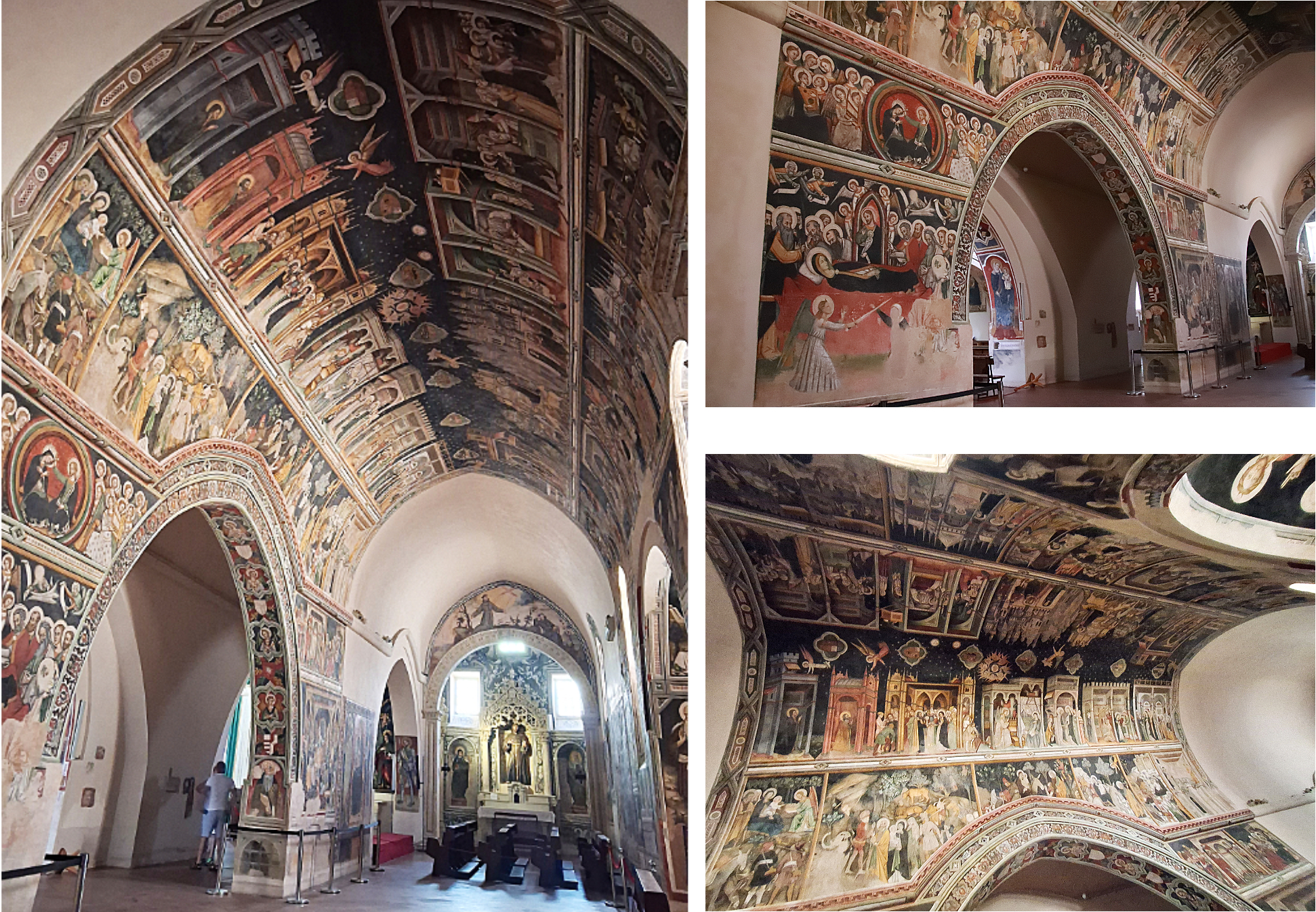 El interior está completamente recubierto de frescos del siglo XV, obra de varios autores (entre ellos, Franciscus De Arecio), con escenas del Antiguo y del Nuevo Testamento. Aquí vemos imágenes de la nave central.